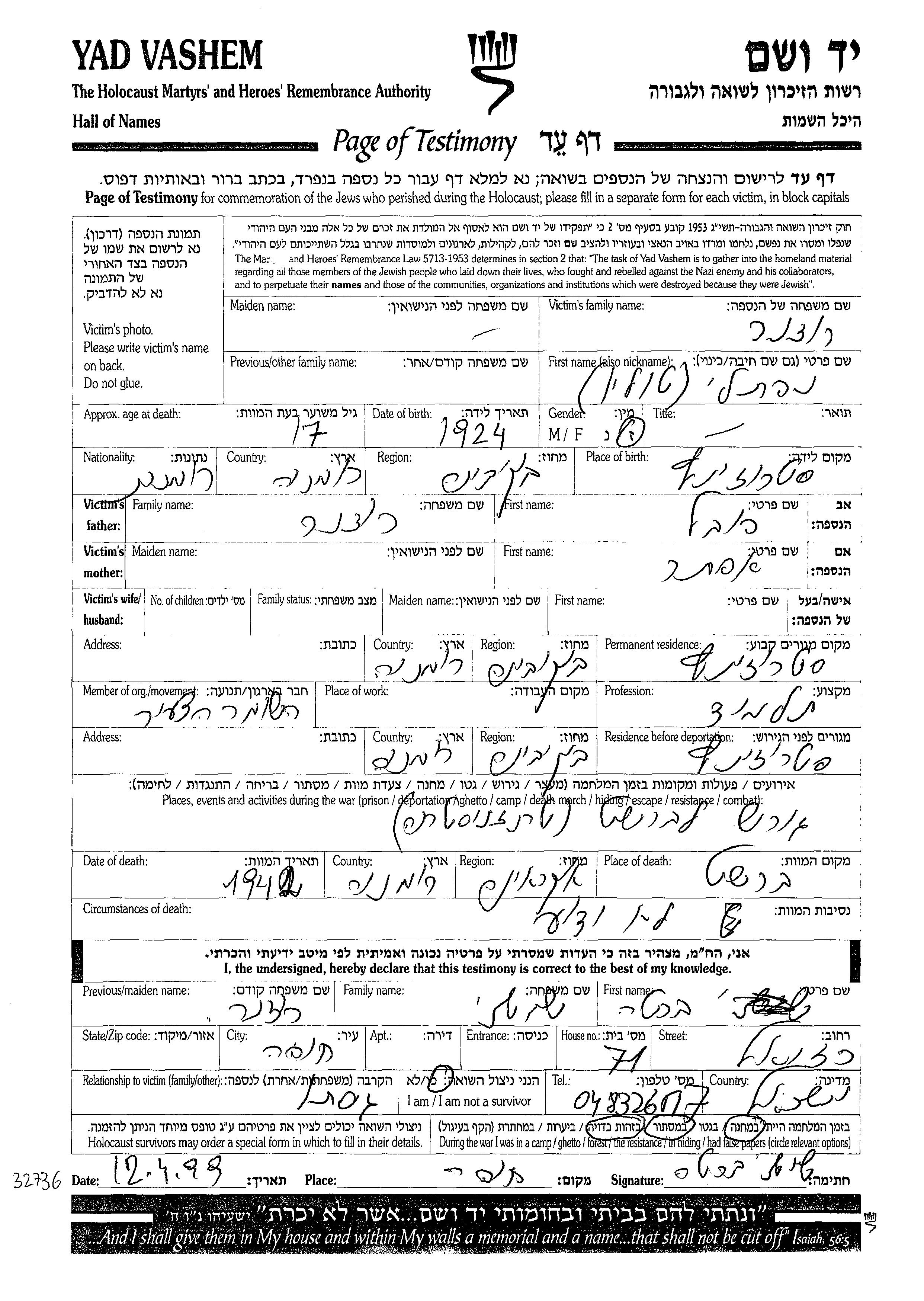 Naftali wurde in der Schoah ermordet. Todesort: Bershad, Ukraine (UdSSR) im Jahr 1942.