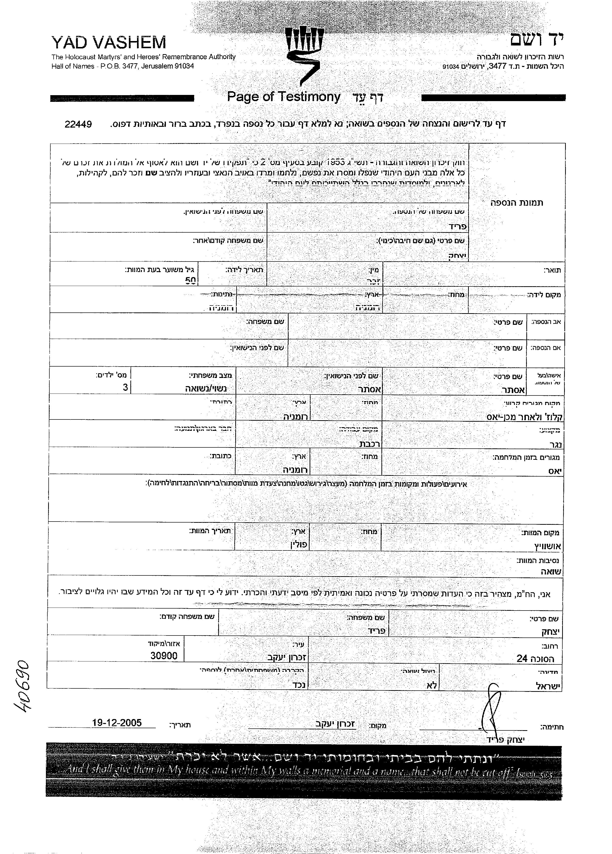 Frid Yitzkhak Cluj, Rumänien Gedenkblatt (digital)