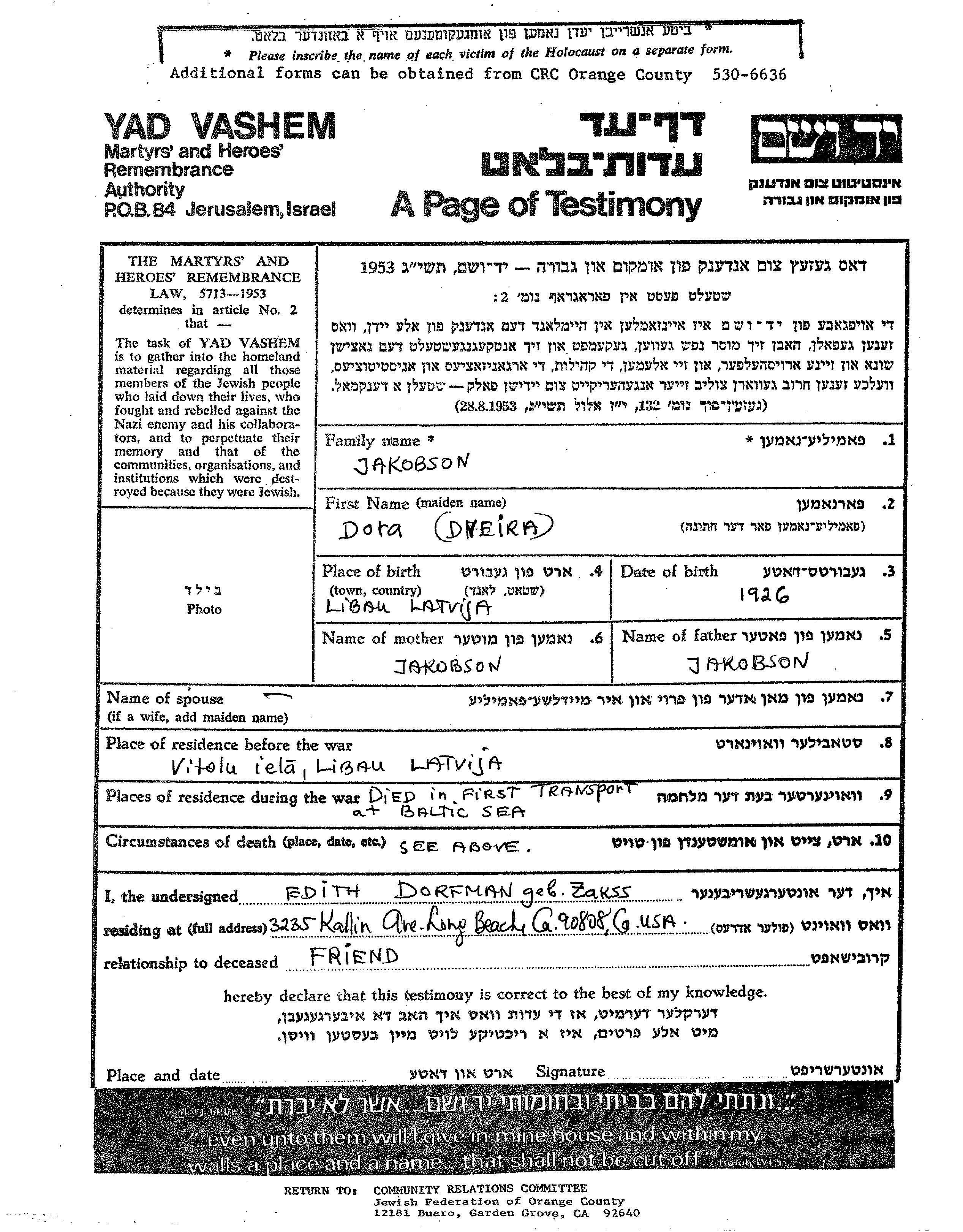 Dora Dveira Jakobson wurde im Jahr 1926 in Libau, Lettland geboren. Vor dem Zweiten Weltkrieg lebte sie in Libau, Lettland.