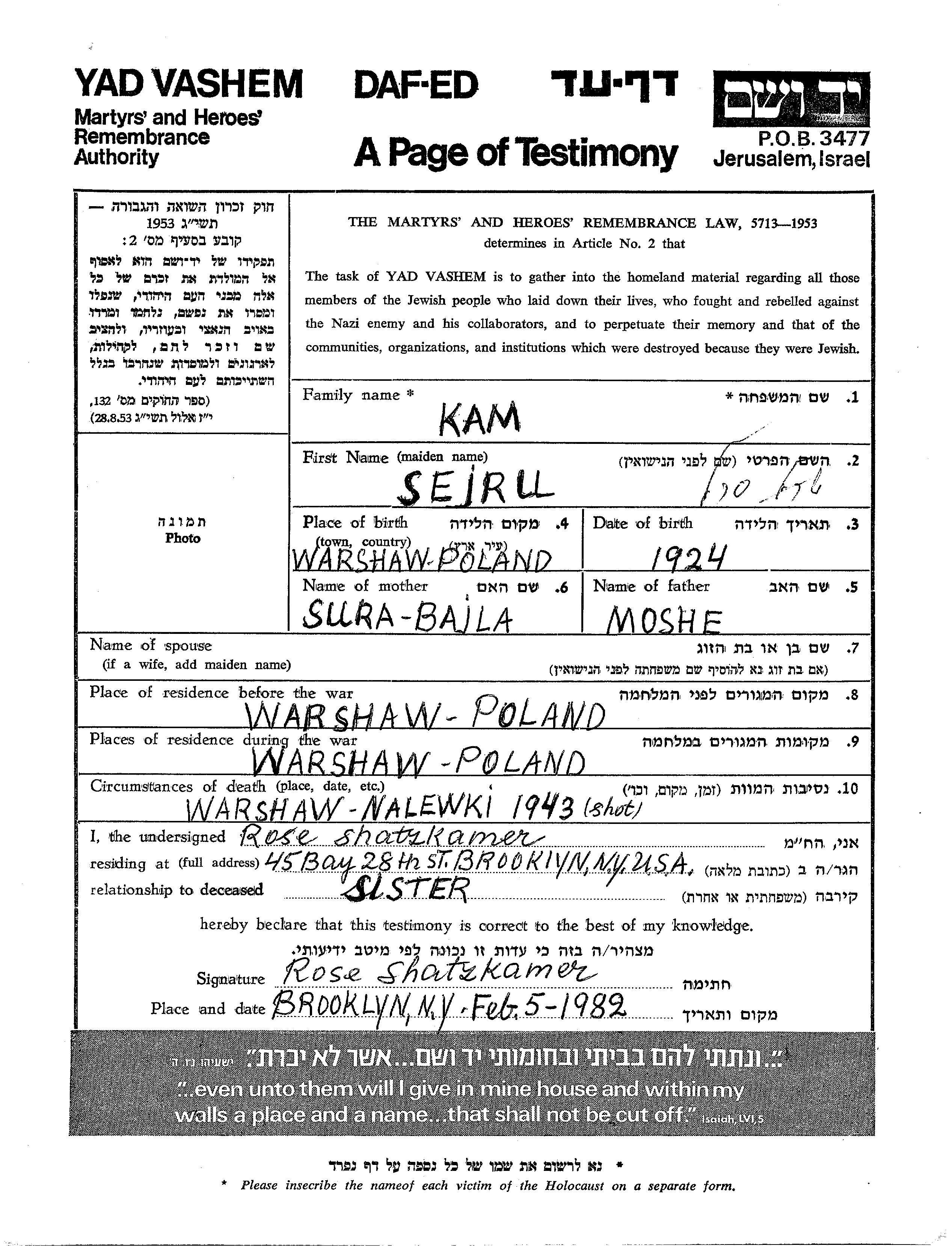 Sejrl Charles wurde in der Schoah ermordet. Todesort: Warszawa, Polen im Jahr 1943.