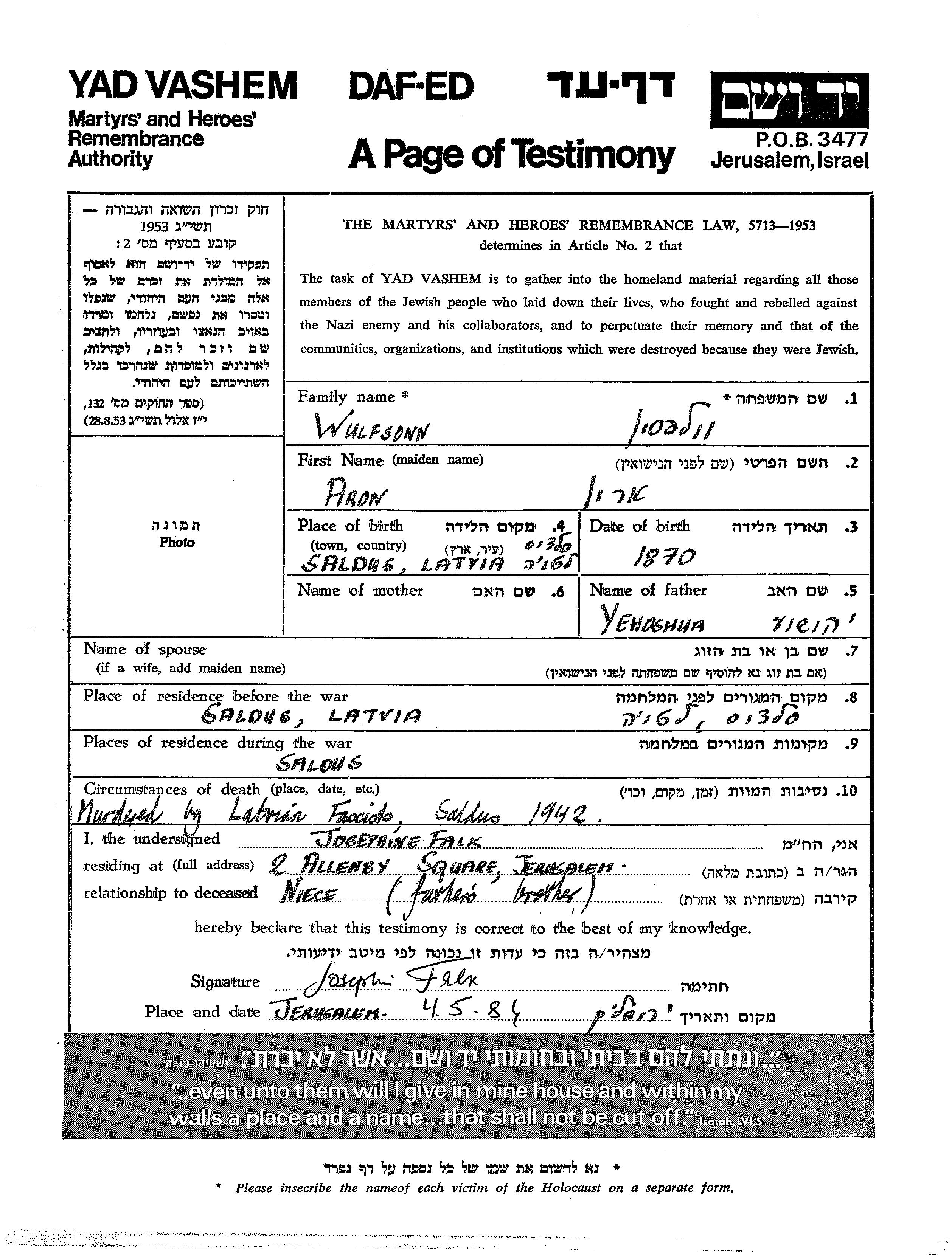 Aron Wulfsonn wurde im Jahr 1870 in Saldus, Lettland geboren. Er war der Sohn von Yehoshua. Vor dem Zweiten Weltkrieg lebte er in Saldus, Lettland. Während des Krieges war er in Saldus, Lettland.