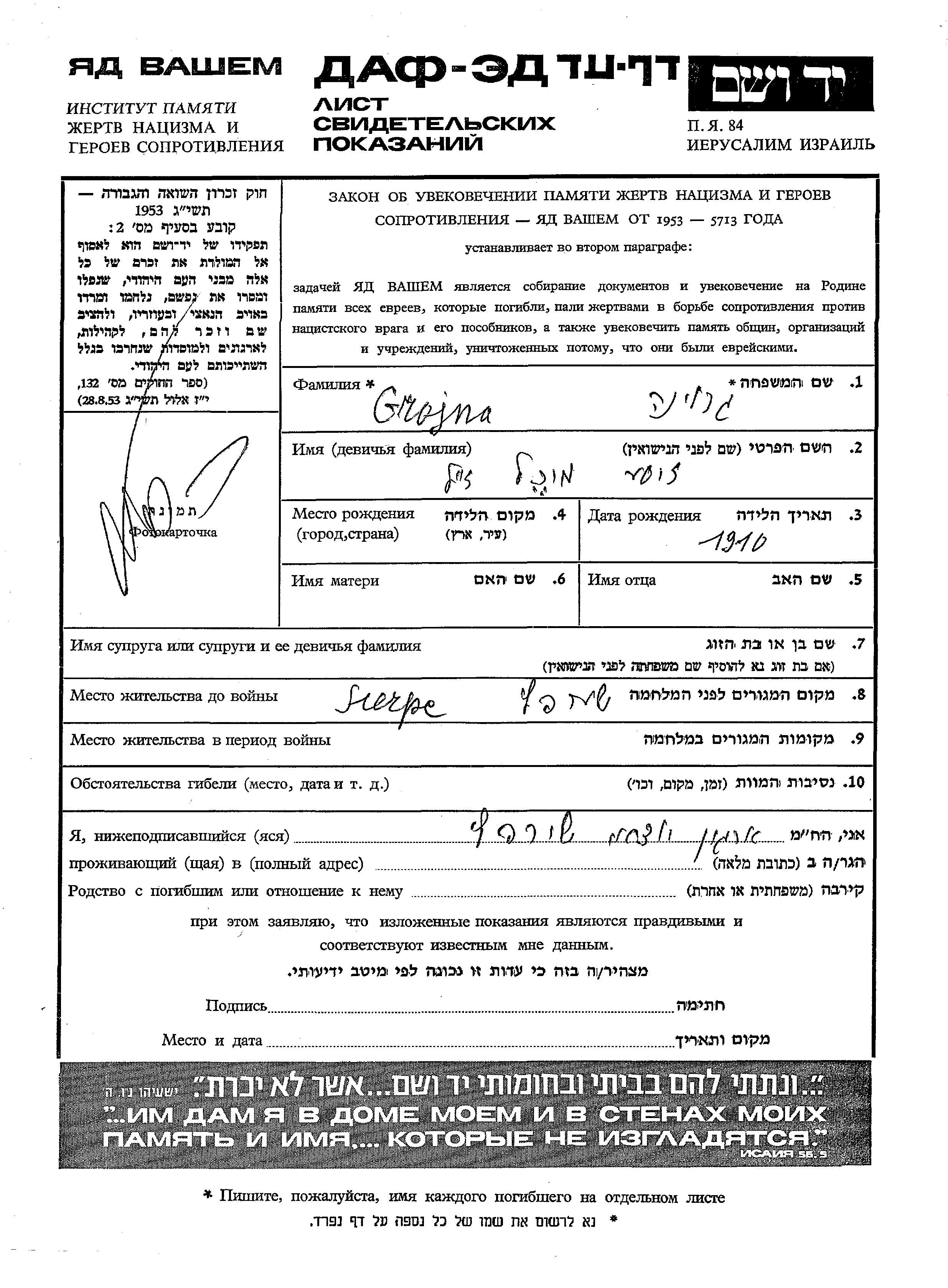 Zise Mikhel Grojna wurde im Jahr 1910 geboren. Vor dem Zweiten Weltkrieg lebte sie in Sierpc, Polen.