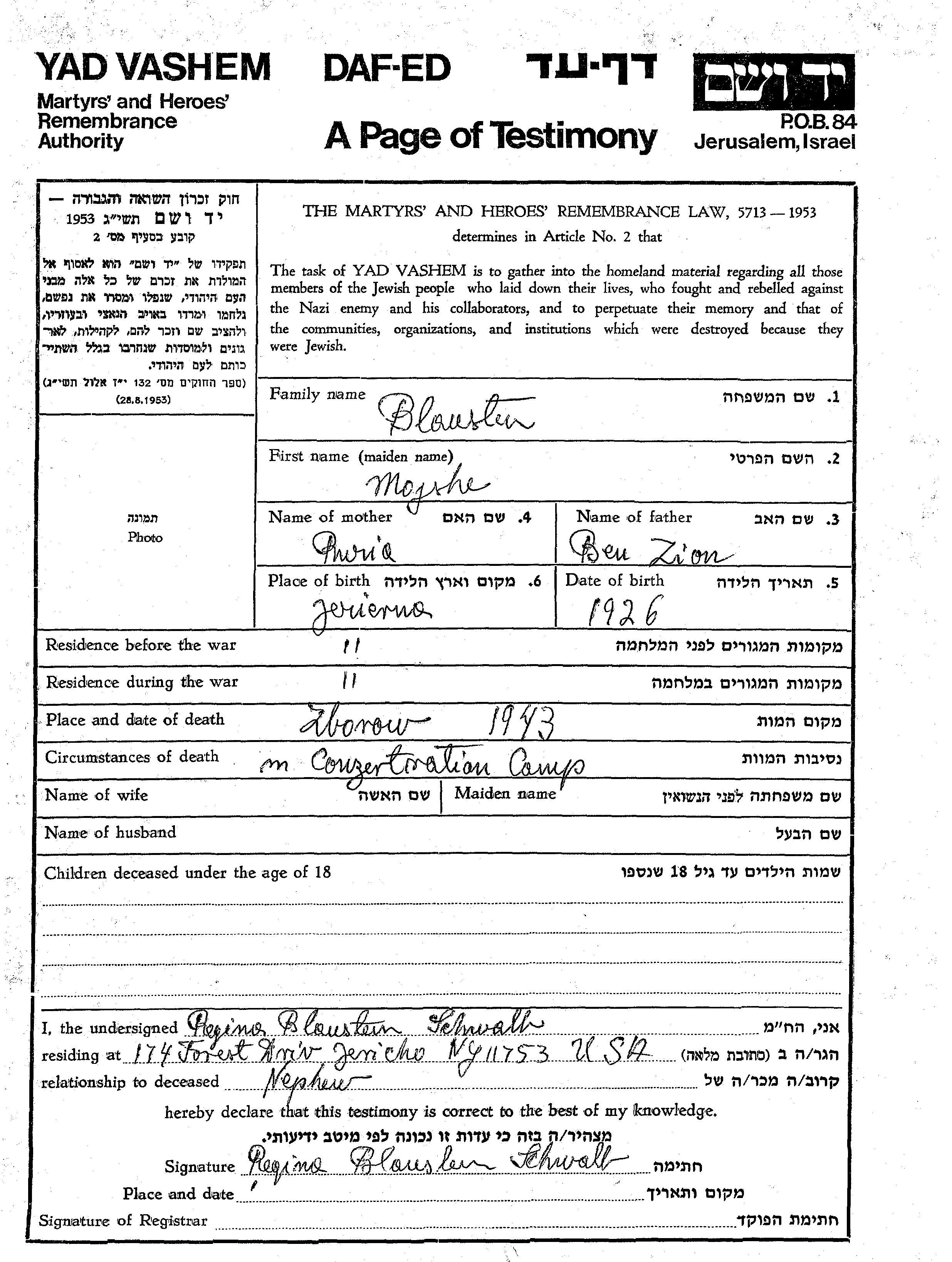 Moyshe Blaustein wurde im Jahr 1926 in Jezierna, Polen geboren. Er war der Sohn von Ben Zion und Bruria. Vor dem Zweiten Weltkrieg lebte er in Jezierna, Polen. Während des Krieges war er in Jezierna, Polen.