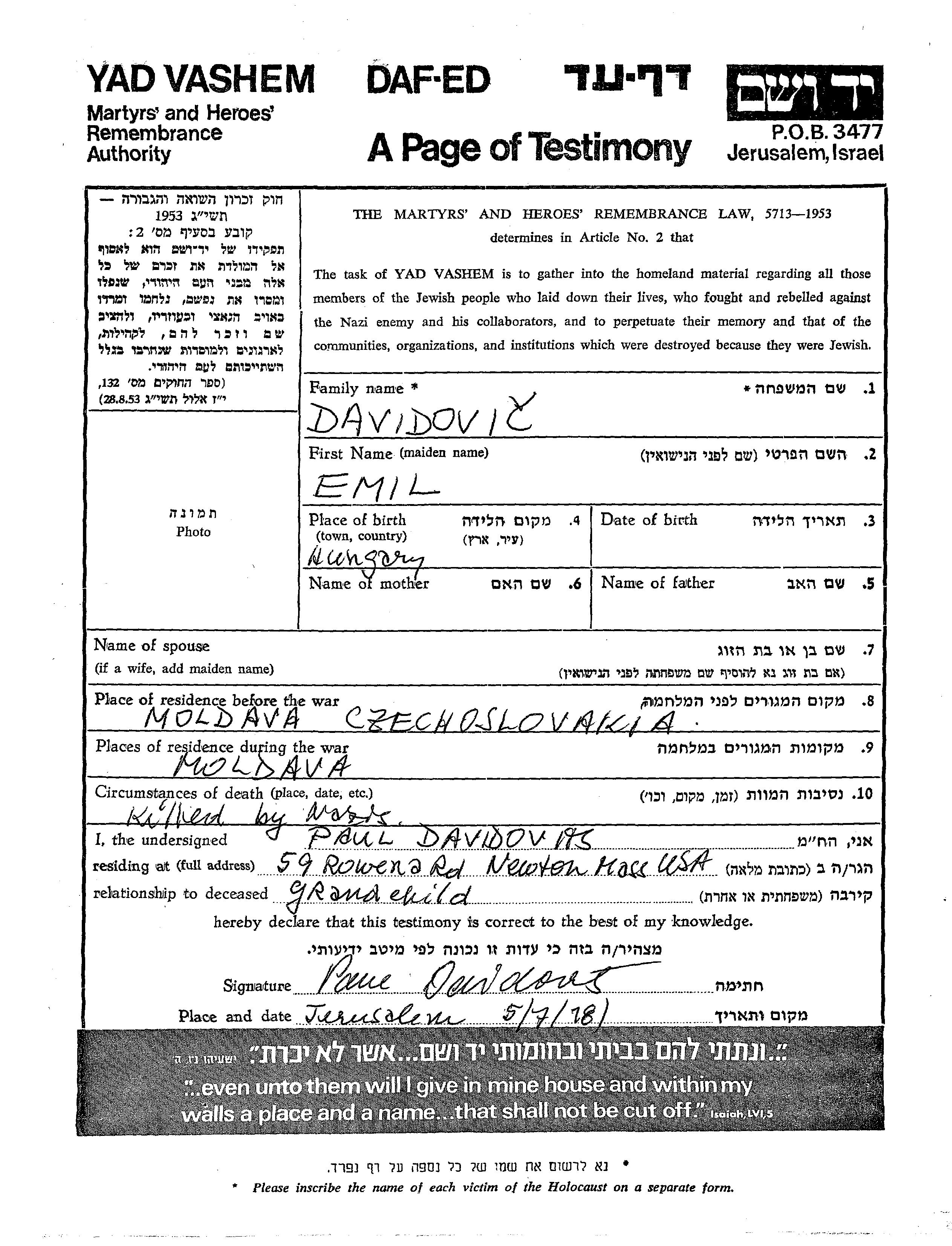 Emil Davidovic wurde in Ungarn geboren. Vor dem Zweiten Weltkrieg lebte er in Moldava Bodvou, Tschechoslowakei. Während des Krieges war er in Moldava Bodvou, Tschechoslowakei.