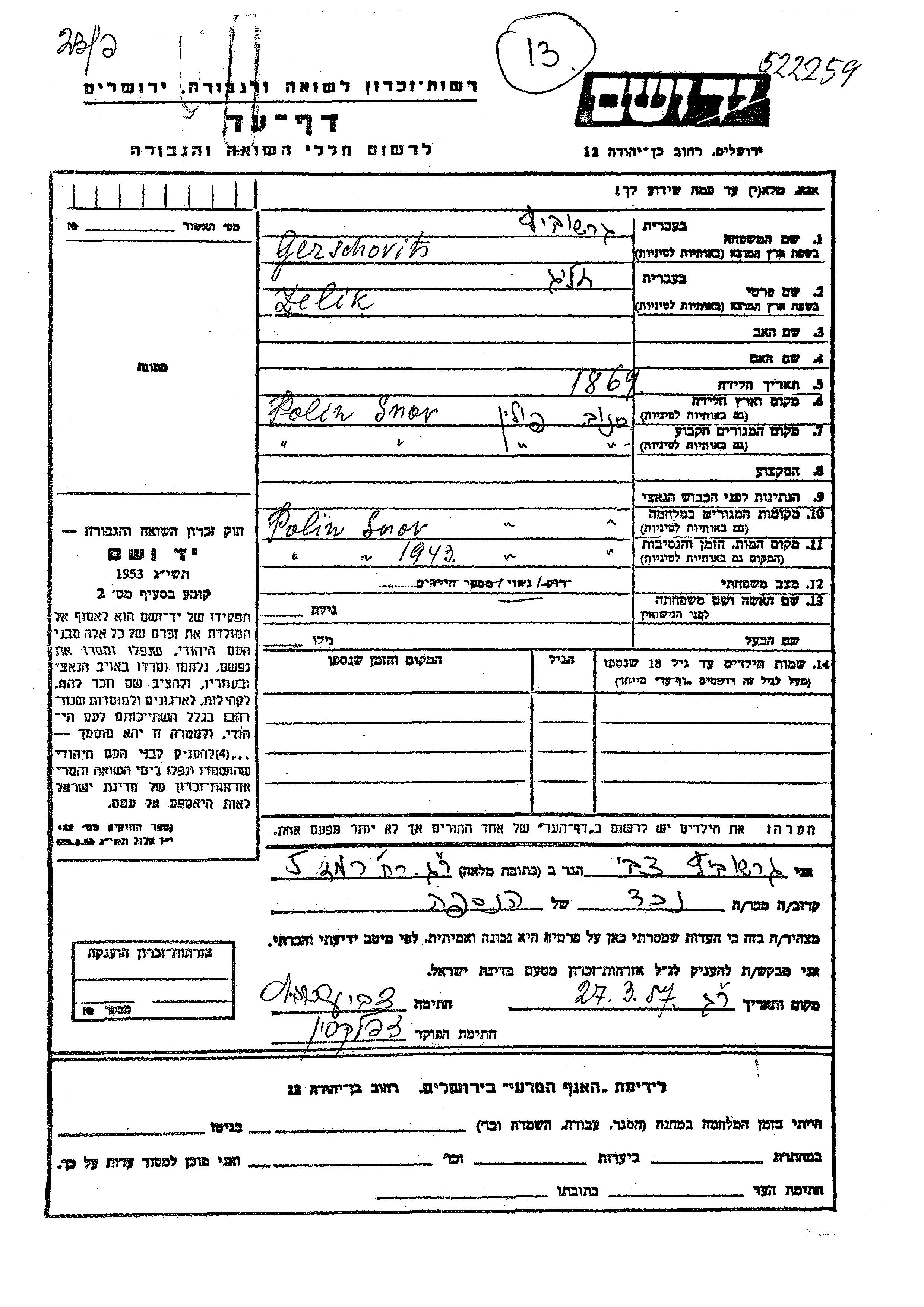 Zelig Gerschovitz wurde im Jahr 1869 in Snov, Polen geboren. Er war Verheiratet. Vor dem Zweiten Weltkrieg lebte er in Snov, Polen. Während des Krieges war er in Snov, Polen.