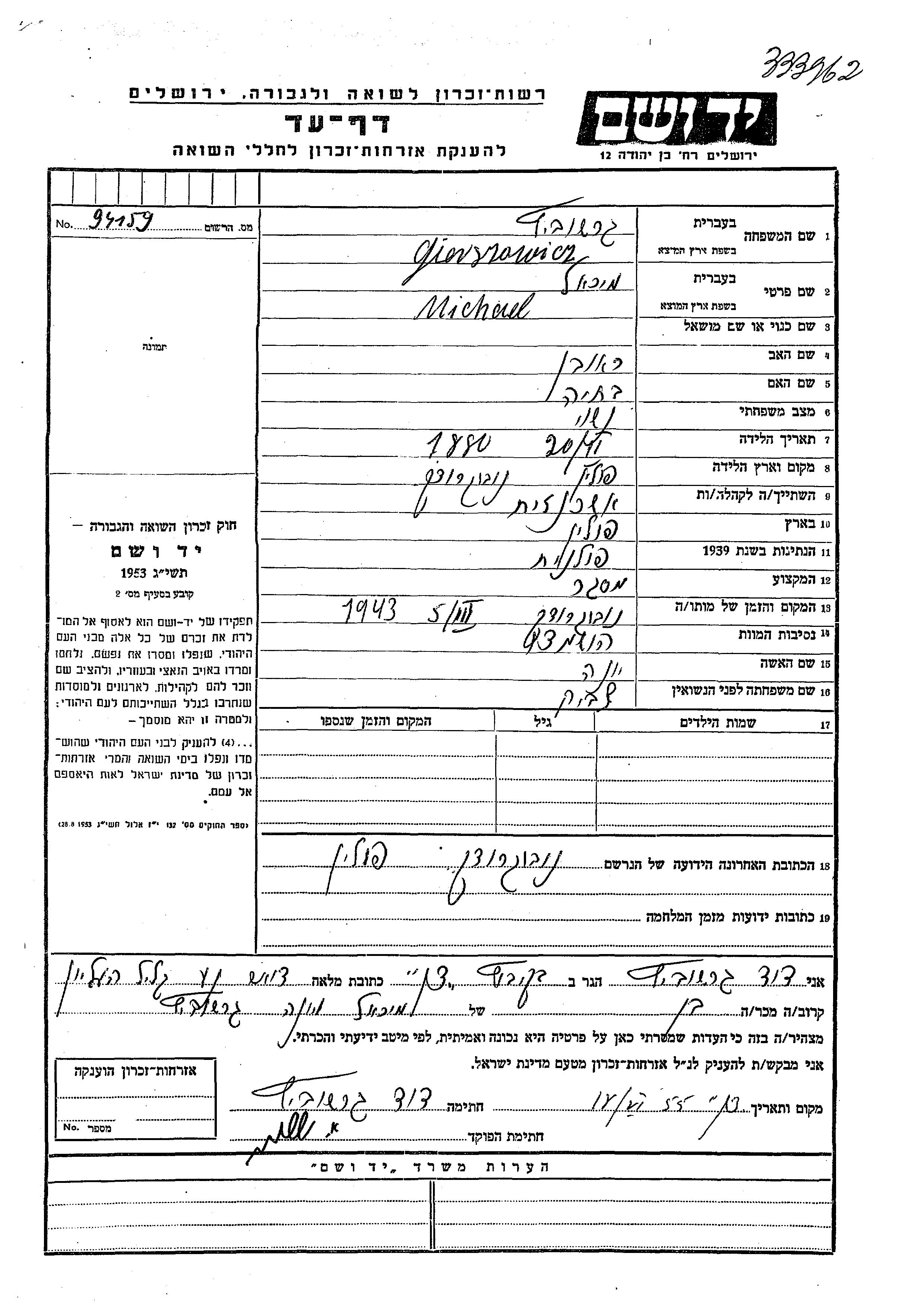 Michael wurde in der Schoah ermordet. Todesort: Novogrodek, Polen im Jahr 05/03/1943.
