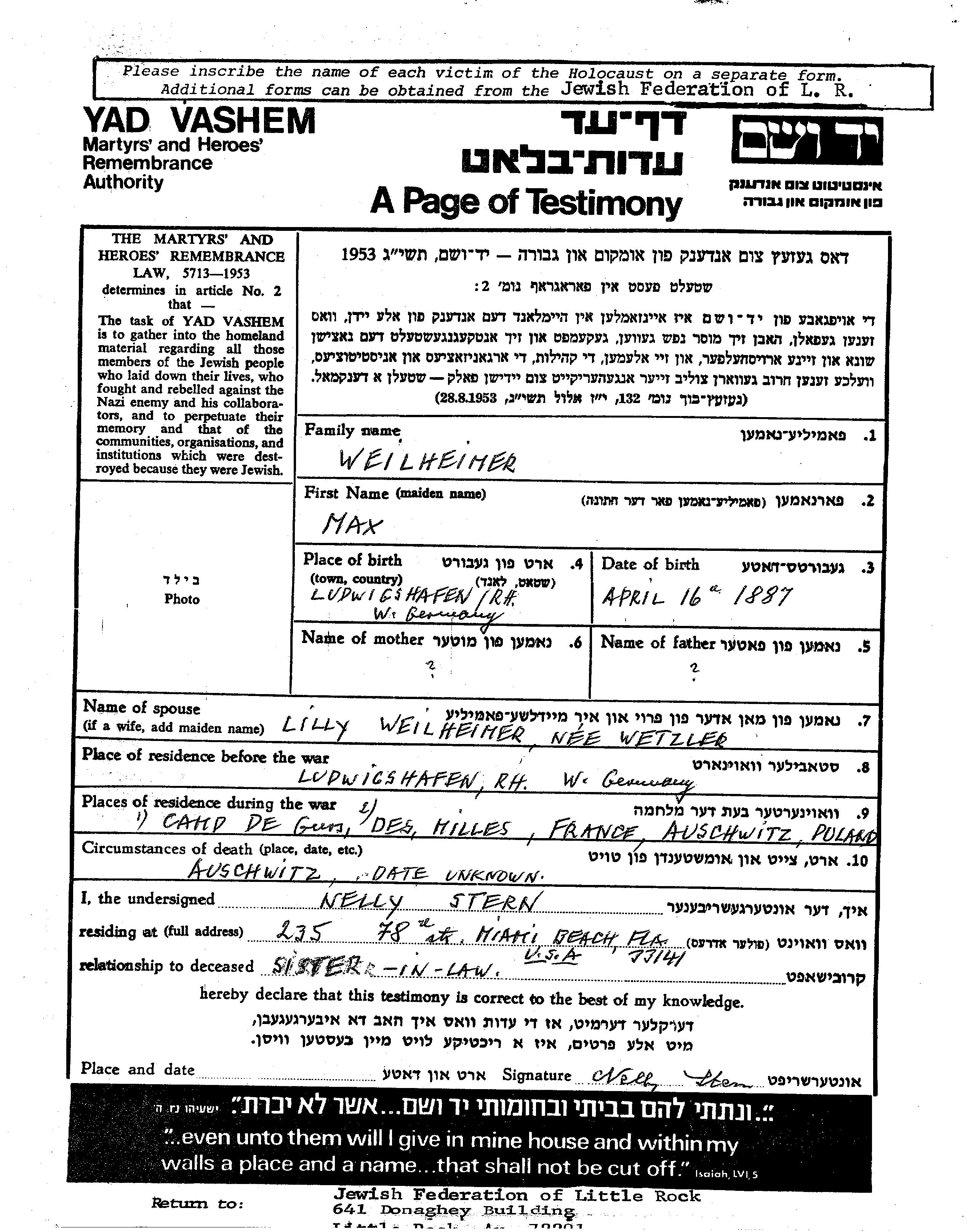 Max Weilheimer wurde im Jahr 1887 in Ludwigshafen am Rhein, Deutsches Reich geboren. Er war mit Lilly, geb. Wetzler Verheiratet. Vor dem Zweiten Weltkrieg lebte er in Pirmasens, Deutsches Reich. Während des Krieges war er in Auschwitz, Polen.