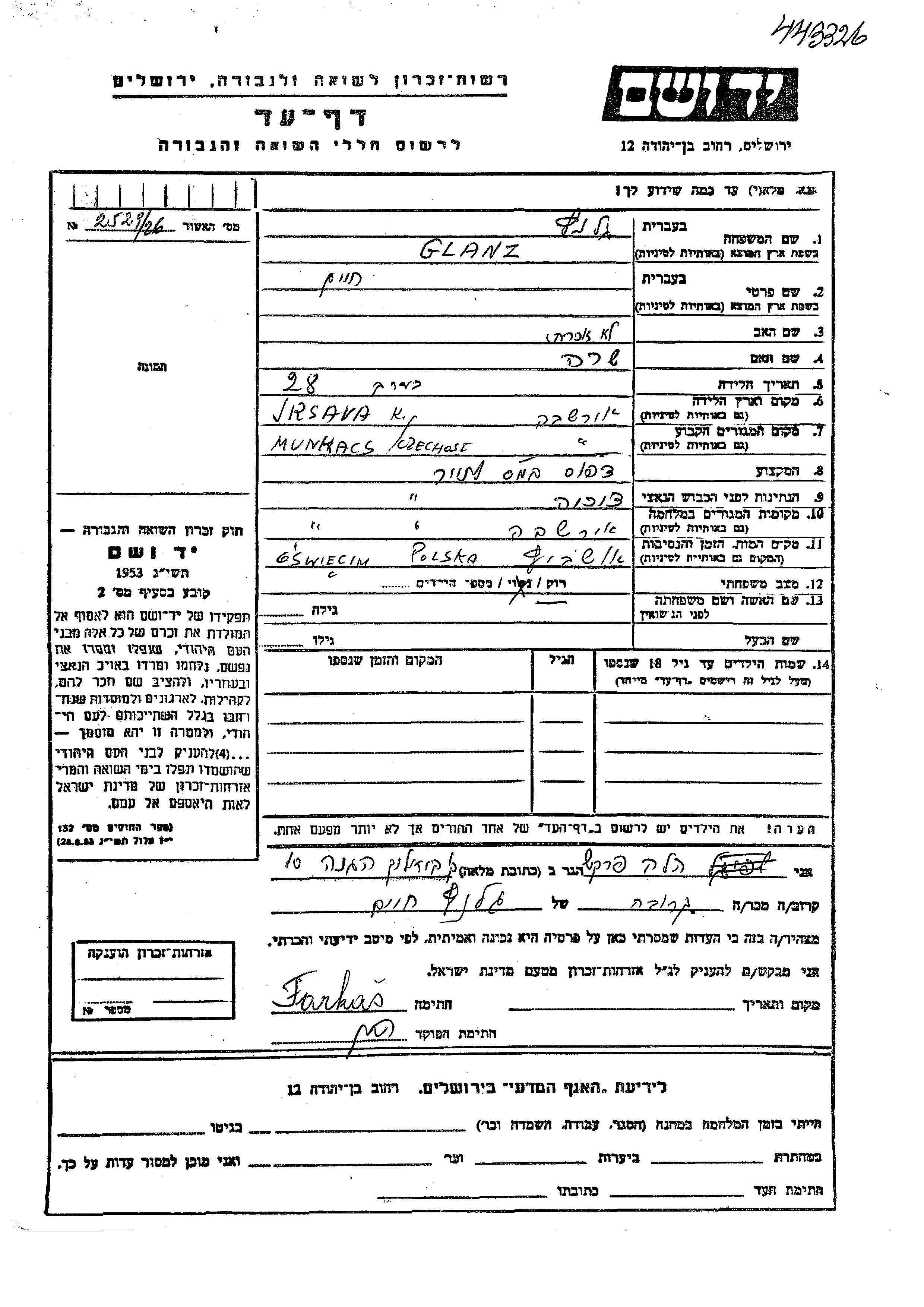 Khaim Glanz wurde in Irsava, Tschechoslowakei geboren. Er war der Sohn von Sara. Er war Ledig. Vor dem Zweiten Weltkrieg lebte er in Munkacs, Tschechoslowakei. Während des Krieges war er in Irsava, Tschechoslowakei.