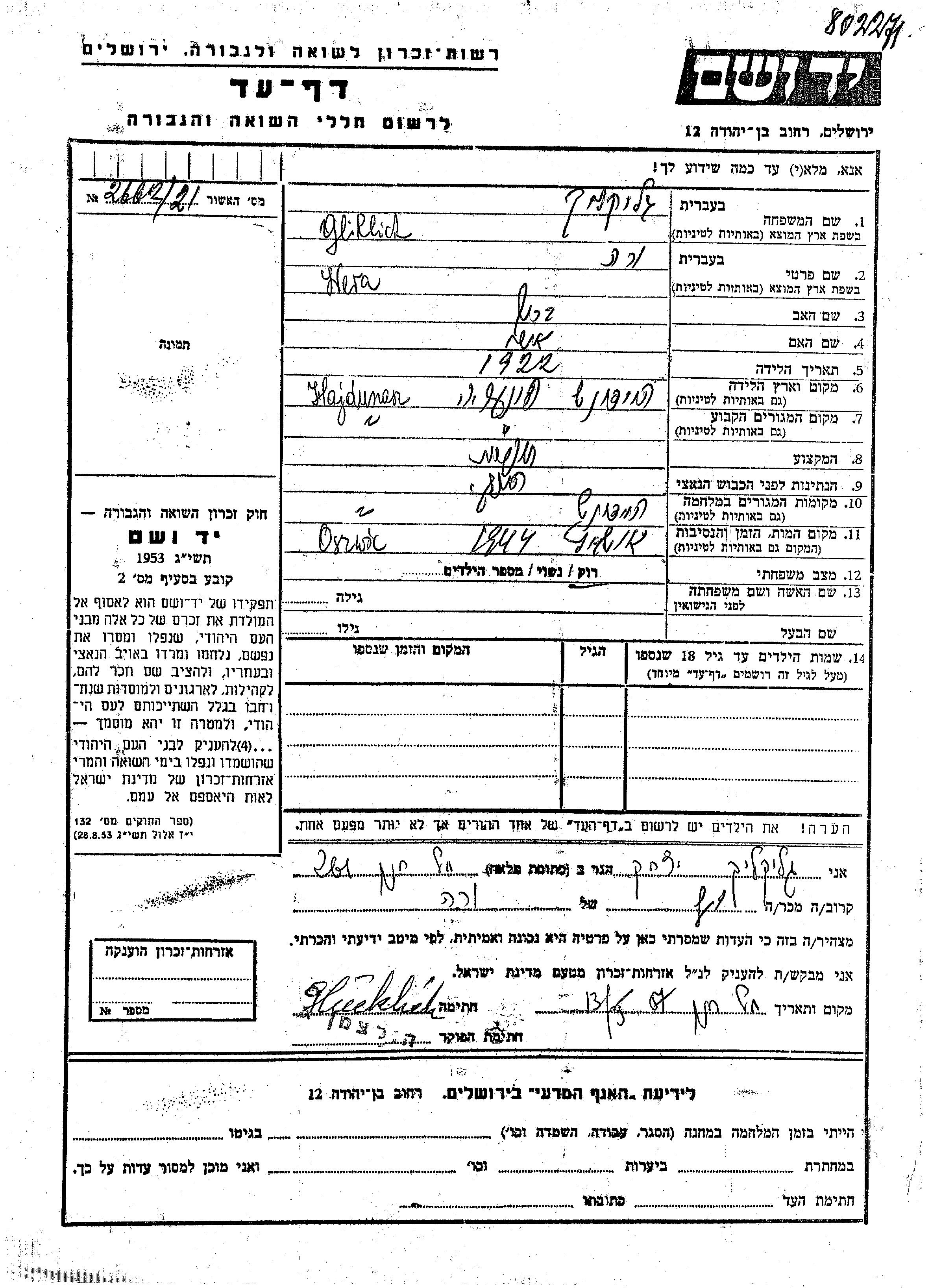 Wera Gliklich wurde im Jahr 1922 in Hajdunasz, Ungarn geboren. Sie war die Tochter von Barukh und Asher Ester. Sie war Schneiderin und Ledig. Vor dem Zweiten Weltkrieg lebte sie in Hajdunasz, Ungarn. Während des Krieges war sie in Hajdunasz, Ungarn.