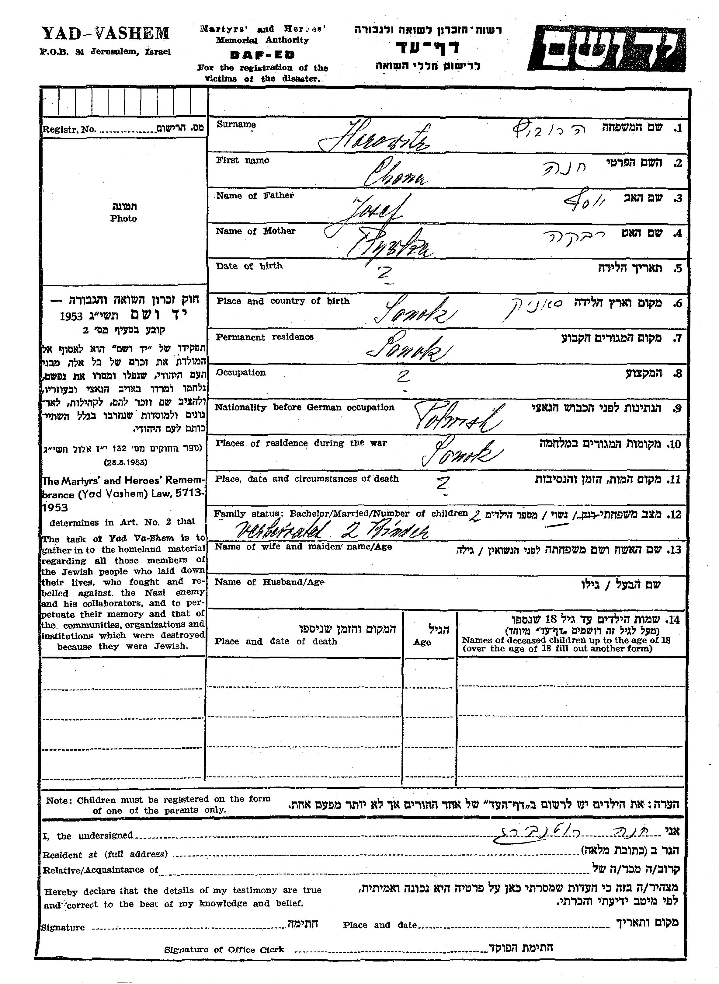 Chona Khana Harowitz wurde in Sanok, Polen geboren. Sie war die Tochter von Josef und Rywka. Sie war Verheiratet. Vor dem Zweiten Weltkrieg lebte sie in Sanok, Polen. Während des Krieges war sie in Sanok, Polen.
