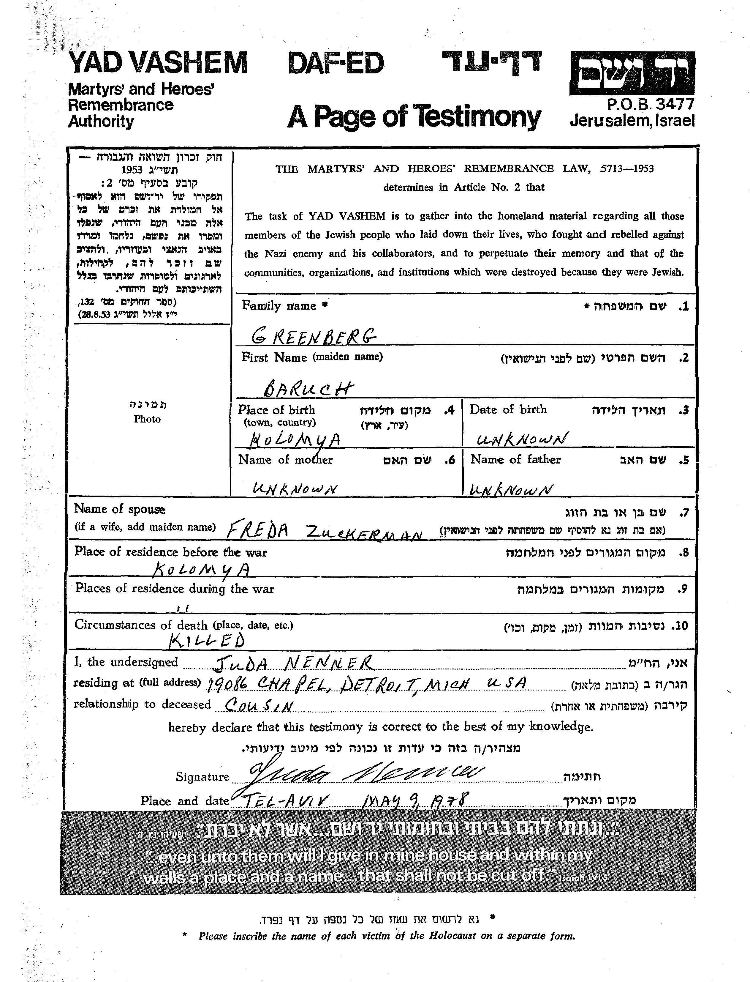 Baruch Greenberg wurde in Kolomyia, Polen geboren. Er war mit Freda, geb. Zuckerman Verheiratet. Vor dem Zweiten Weltkrieg lebte er in Kolomyia, Polen. Während des Krieges war er in Kolomyia, Polen.