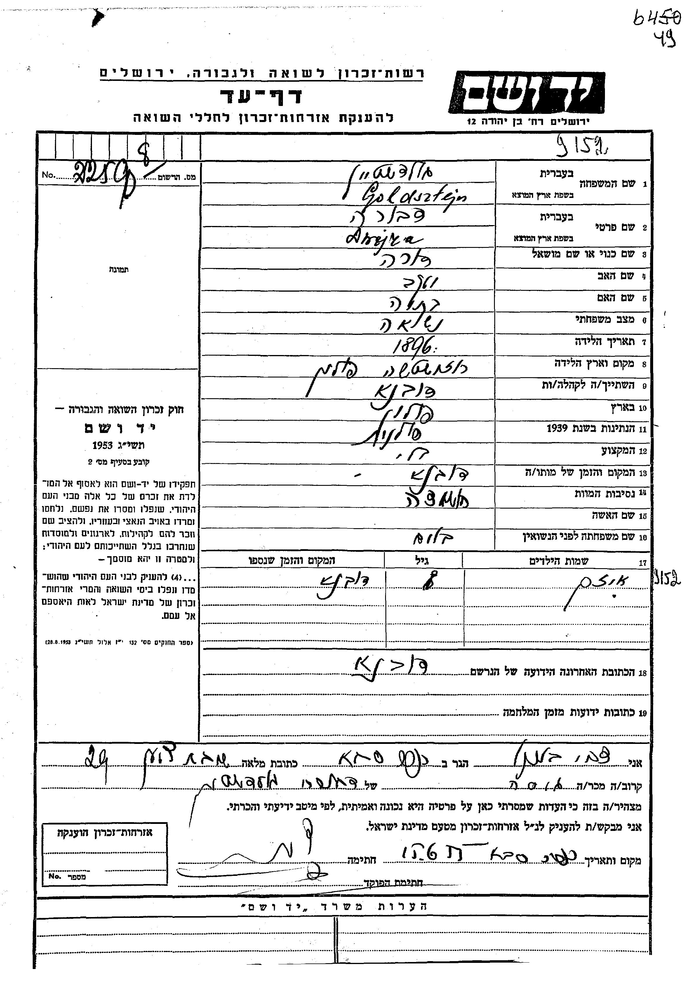Dwojra Goldsztejn, geb. Blum wurde im Jahr 1896 in Roziscie, Polen geboren. Sie war die Tochter von Yaakov und Batia. Sie war Verheiratet. Vor dem Zweiten Weltkrieg lebte sie in Dubno, Polen.