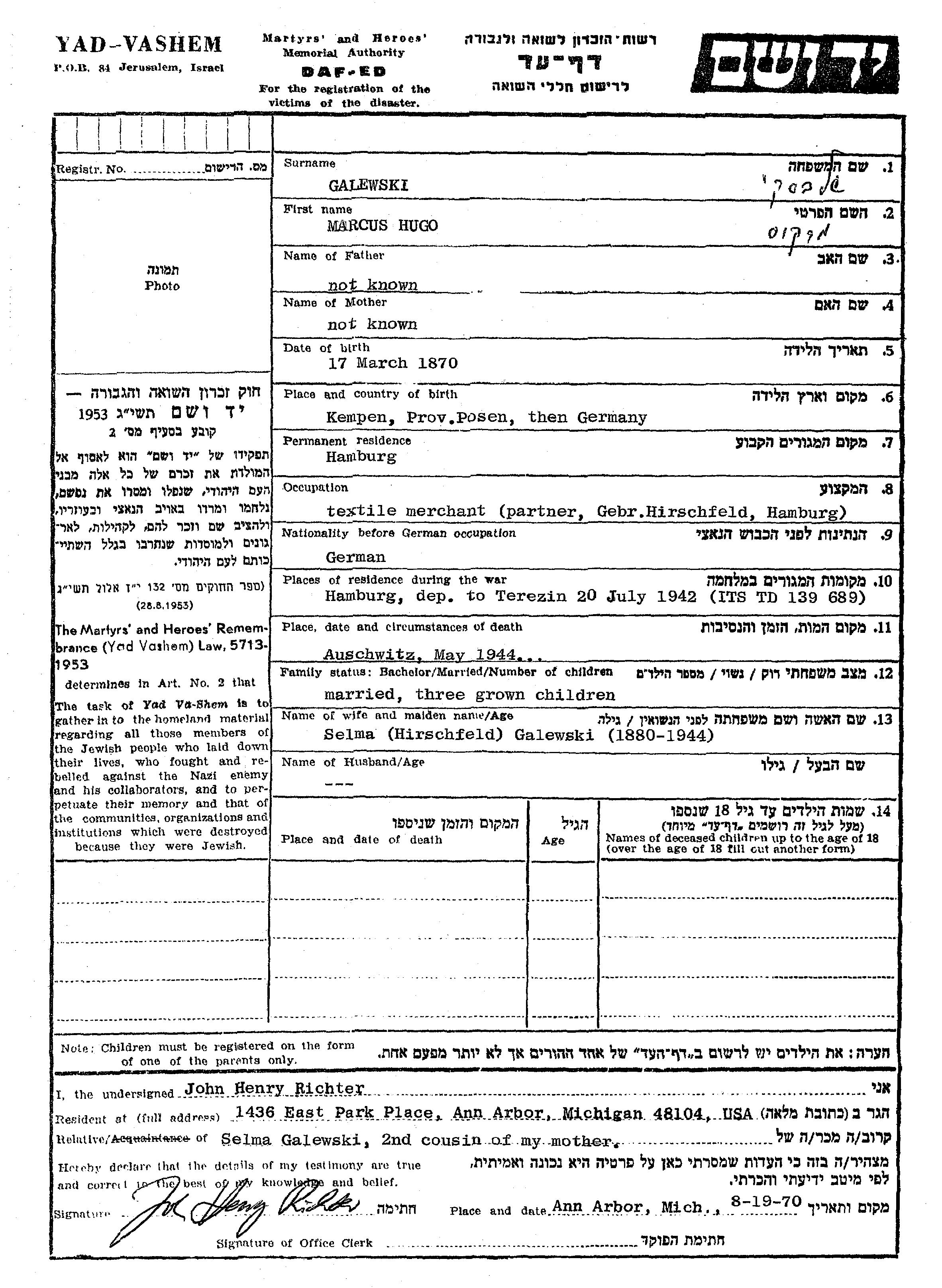 Marcus Hugo Galewski wurde im Jahr 1870 in Kempen geboren. Er war Textilhändler/-in und mit Zelma, geb. Hirschfeld Verheiratet. Vor dem Zweiten Weltkrieg lebte er in Hamburg, Deutsches Reich. Während des Krieges war er in Hamburg, Deutsches Reich.