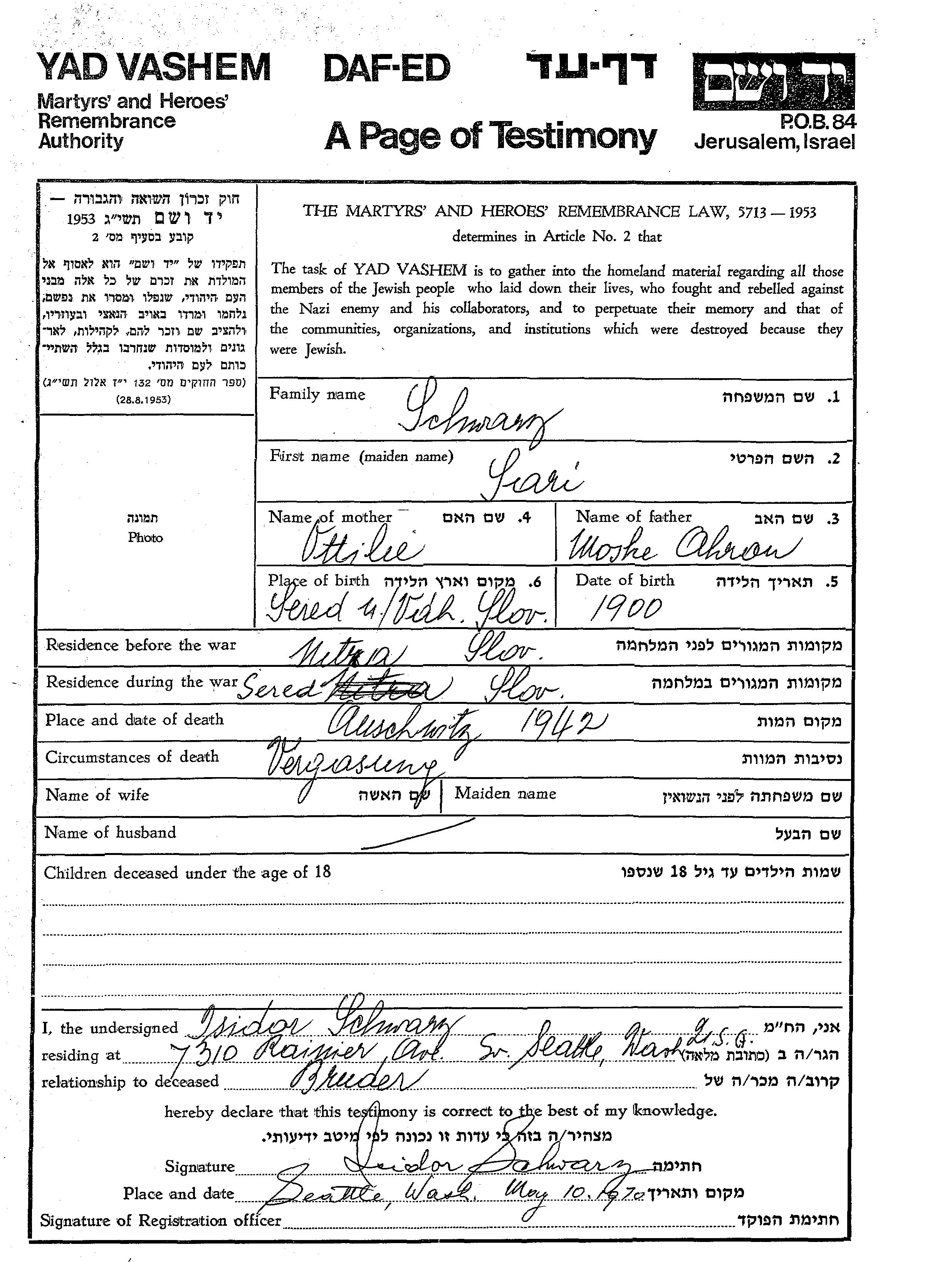 Sari Schwarz wurde im Jahr 1900 in Sered nad Vahom, Tschechoslowakei geboren. Sie war die Tochter von Moshe Ahron und Ottilie. Vor dem Zweiten Weltkrieg lebte sie in Nitra, Tschechoslowakei. Während des Krieges war sie in Sered nad Vahom, Tschechoslowakei.