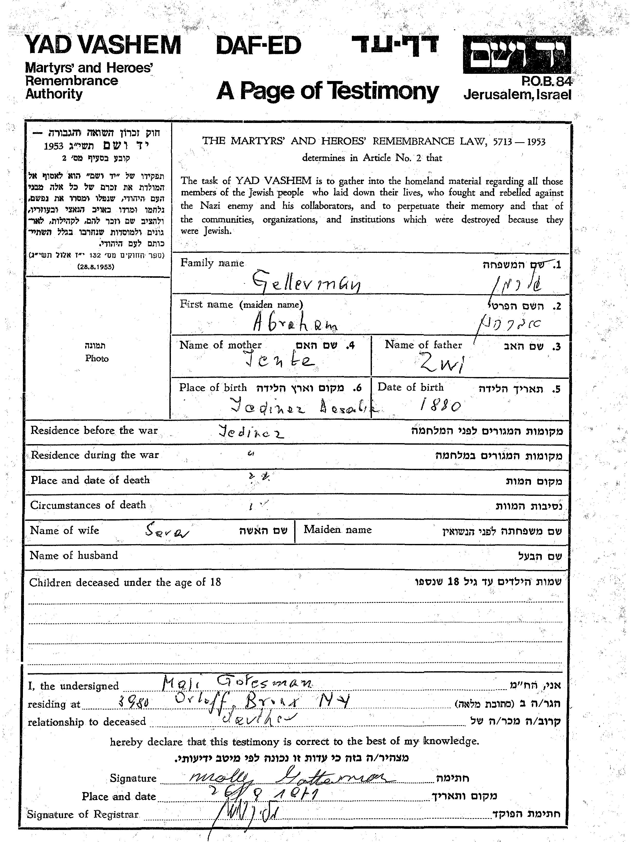 Abraham Gellerman wurde im Jahr 1880 in Jediniz, Rumänien geboren. Er war der Sohn von Zwi und Iente. Er war mit Sara Verheiratet. Vor dem Zweiten Weltkrieg lebte er in Jediniz, Rumänien. Während des Krieges war er in Jediniz, Rumänien.