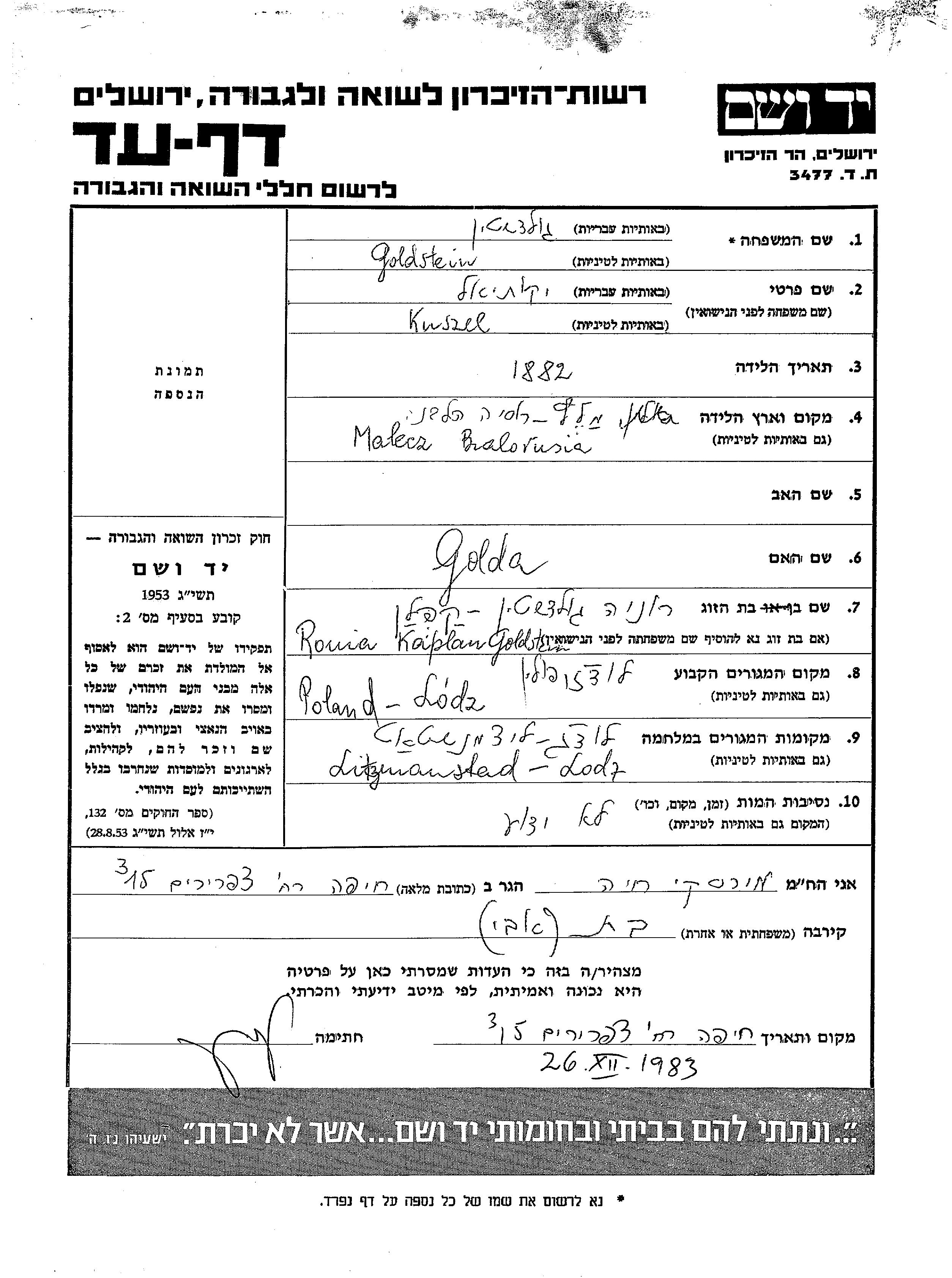 Kuszel Goldstein wurde im Jahr 1882 in Malecz, Polen geboren. Er war der Sohn von Golda. Er war mit Ronia, geb. Kaplan Verheiratet. Vor dem Zweiten Weltkrieg lebte er in Lodz, Polen. Während des Krieges war er in Lodz, Polen.