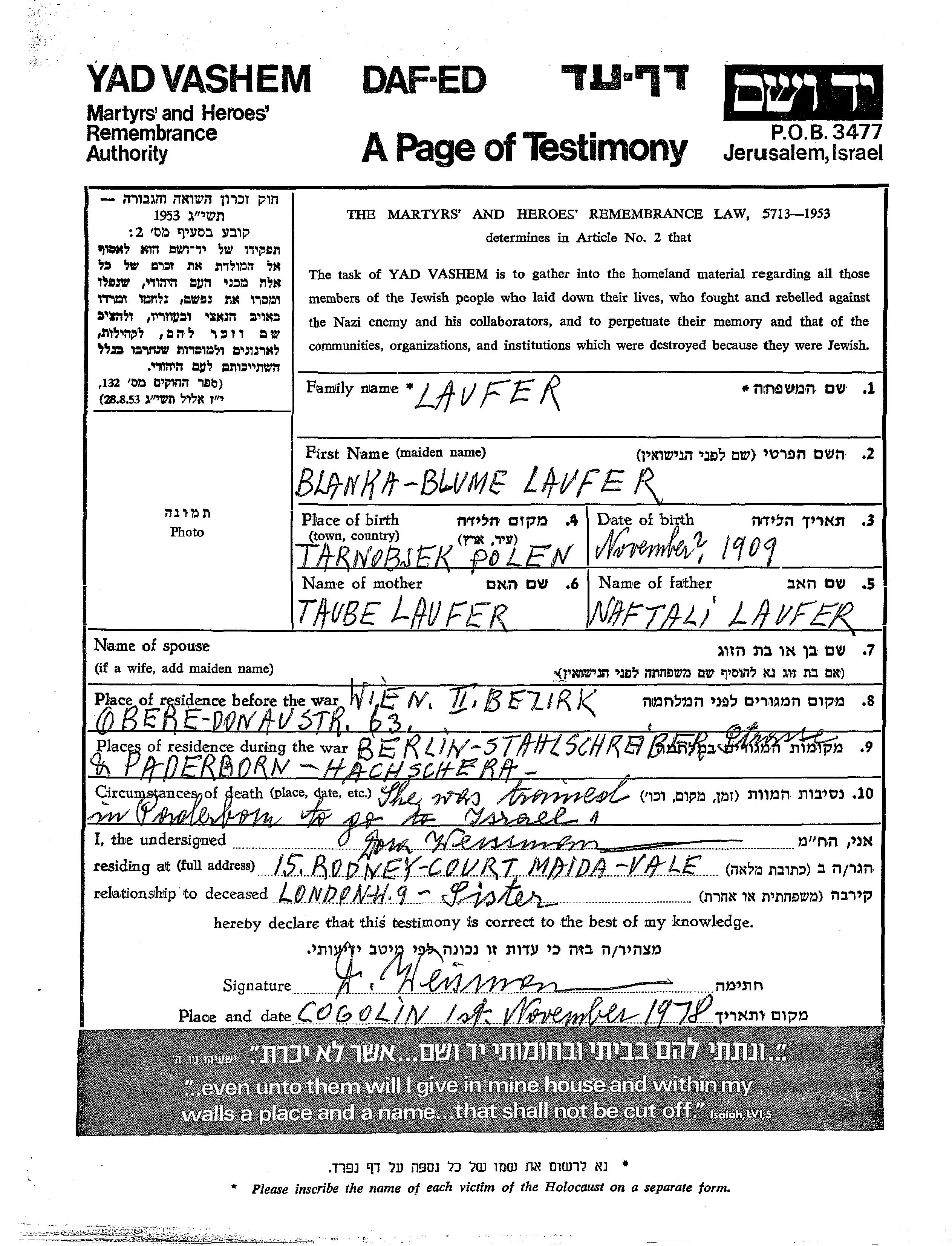 Laufer Blanka Bluma 1909 Wien, Österreich Gedenkblatt