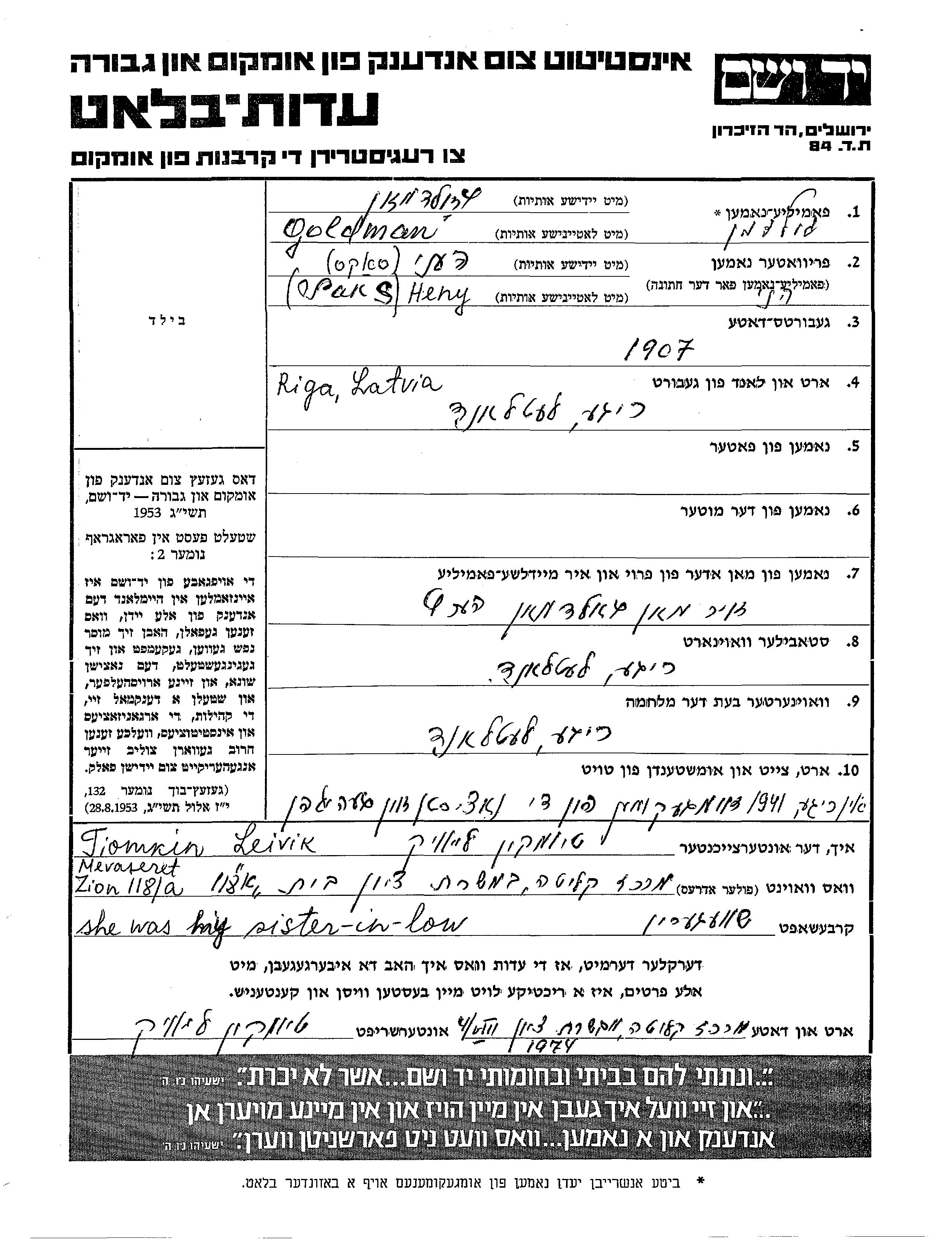 Heny Goldman, geb. Zaks wurde im Jahr 1907 in Riga, Lettland geboren. Vor dem Zweiten Weltkrieg lebte sie in Riga, Lettland. Während des Krieges war sie in Riga, Lettland.