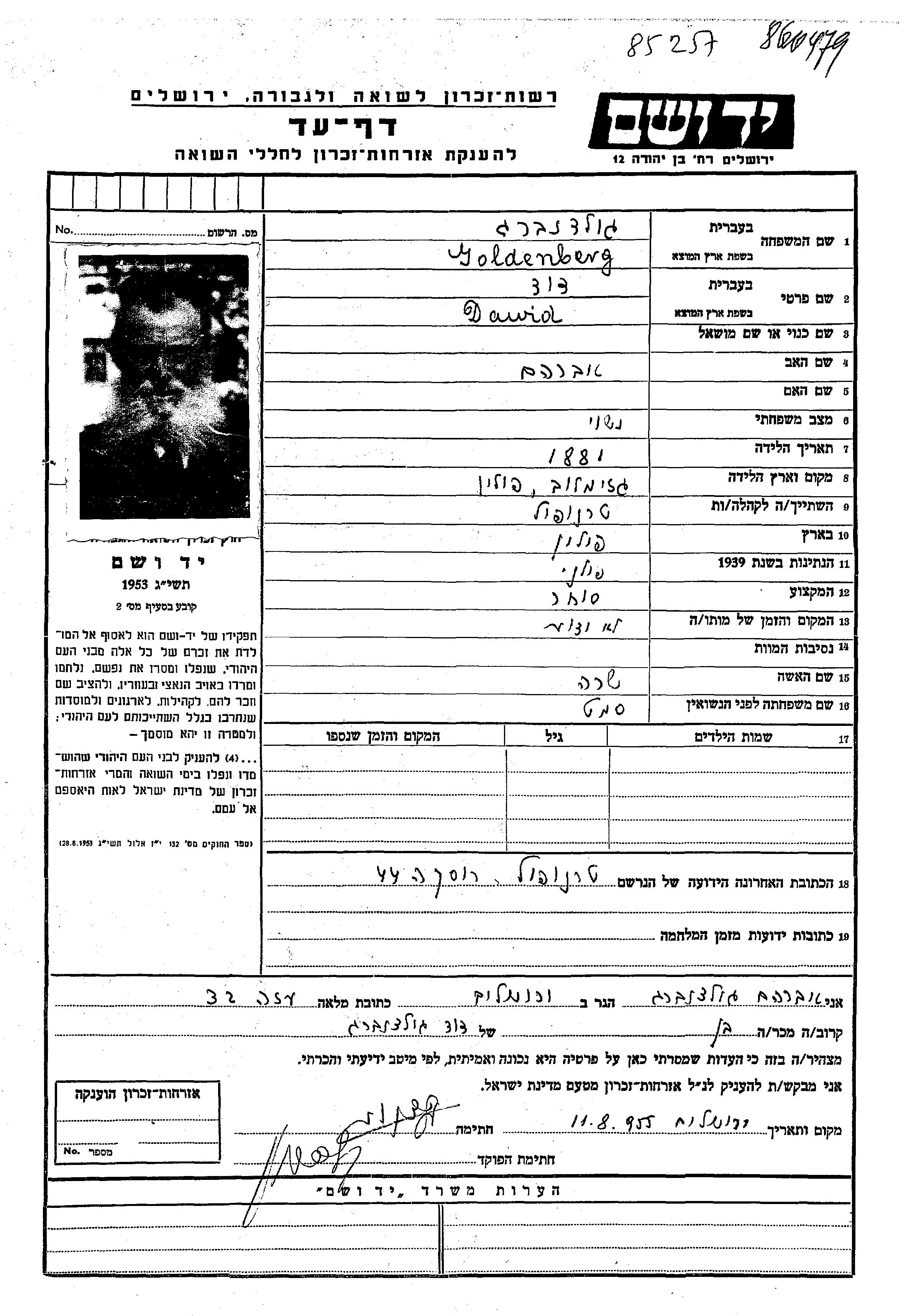 Dawid Goldenberg wurde im Jahr 1881 in Grzymalow, Polen geboren. Er war der Sohn von Avraham. Er war Kaufmann/-frau und mit Sara, geb. Samet Verheiratet. Vor dem Zweiten Weltkrieg lebte er in Tarnopol, Polen.