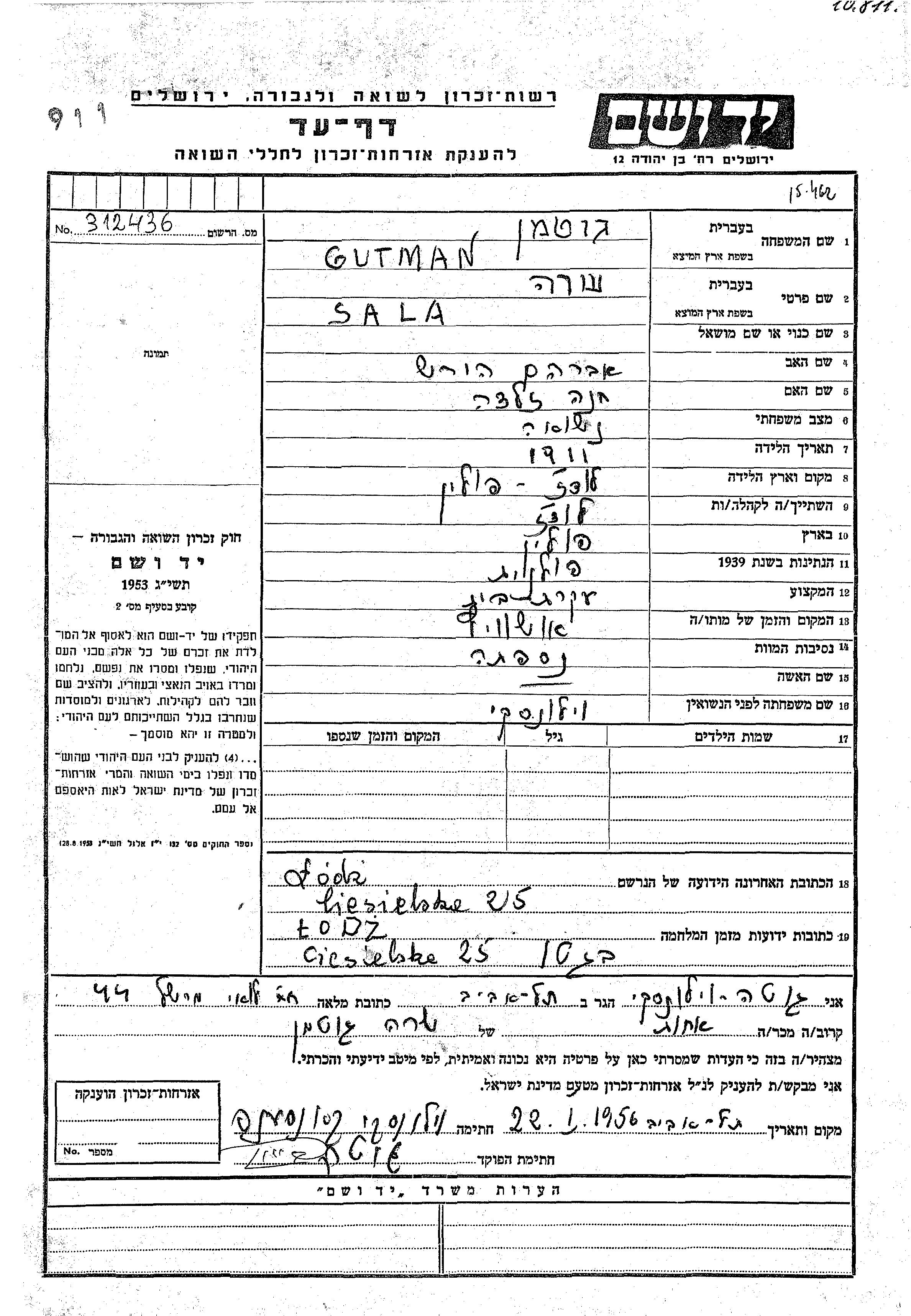 Sala Sara Gutman, geb. Vilunski wurde im Jahr 1911 in Lodz, Polen geboren. Sie war die Tochter von Avraham Hirsh und Khana Zelda. Sie war Hausfrau und Verheiratet. Vor dem Zweiten Weltkrieg lebte sie in Lodz, Polen. Während des Krieges war sie in Lodz, Polen.