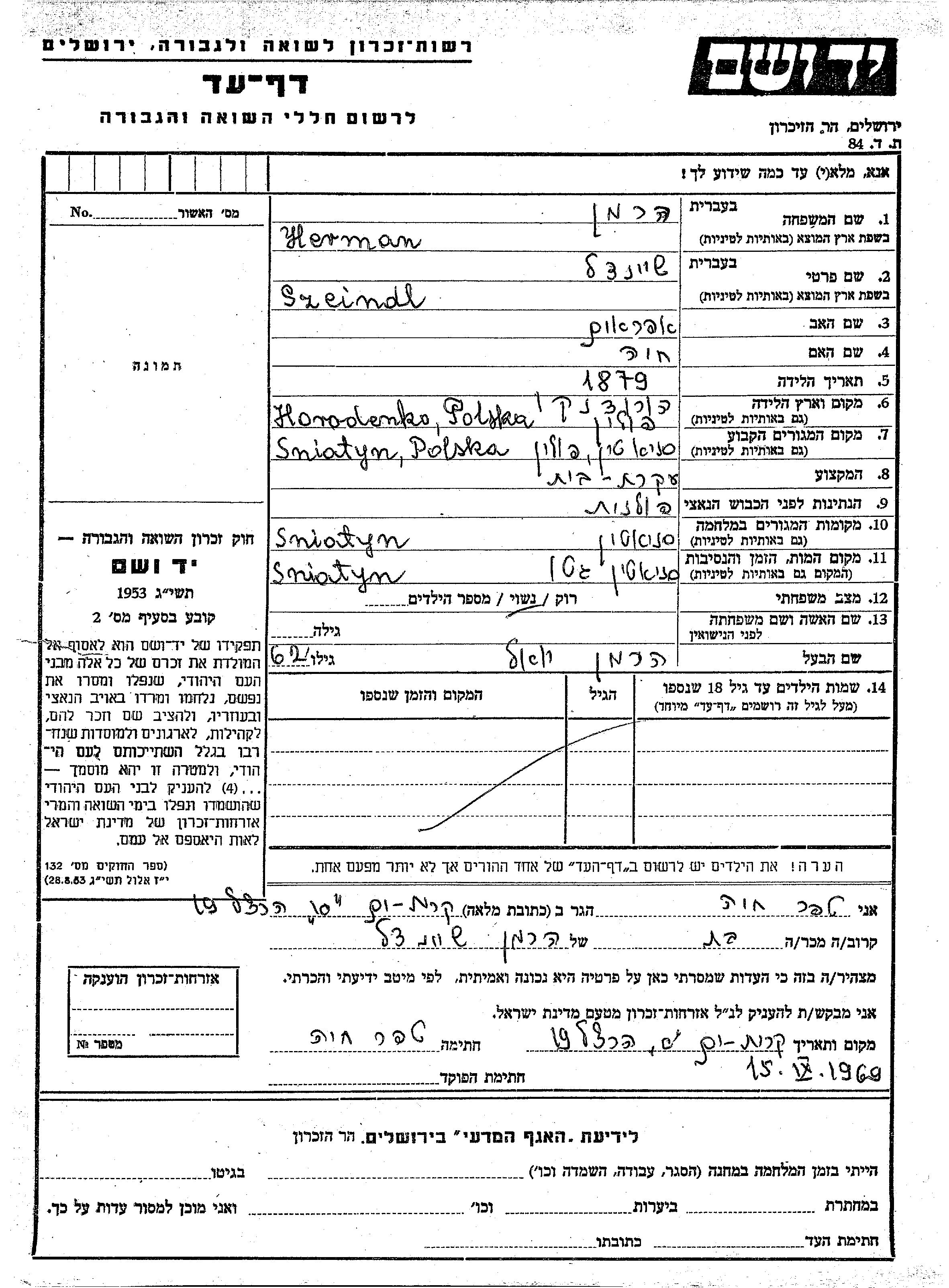 Szeindl Herman wurde im Jahr 1879 in Horodenka, Polen geboren. Sie war die Tochter von Efraim und Khaia. Sie war Hausfrau und mit Herman Yoel Verheiratet. Vor dem Zweiten Weltkrieg lebte sie in Sniatyn, Polen. Während des Krieges war sie in Sniatyn, Polen.