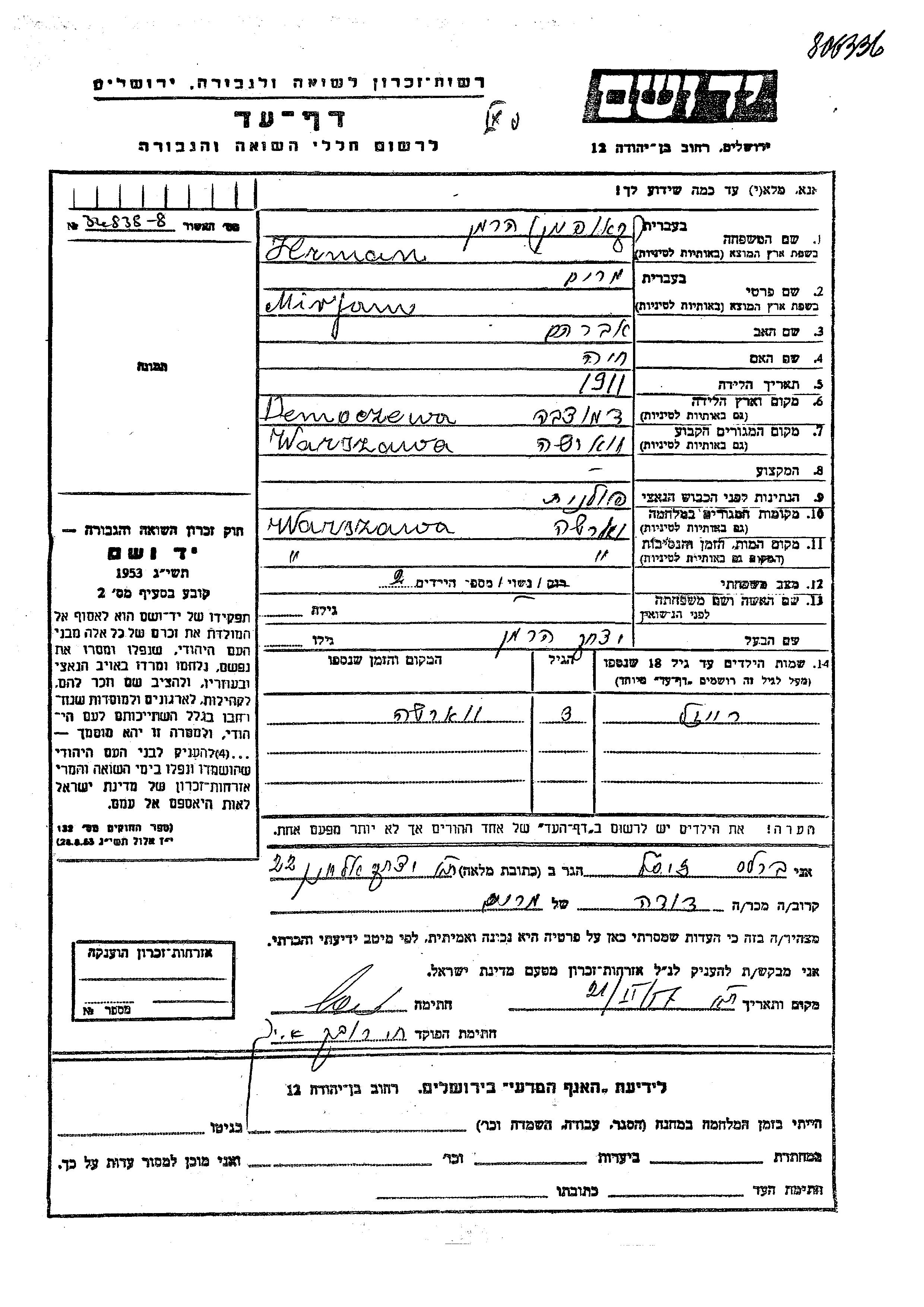 Miryam Herman, geb. Kaufman wurde im Jahr 1911 in Democzewa, Polen geboren. Sie war die Tochter von Avraham und Khaia. Sie war mit Yitzkhak Verheiratet. Vor dem Zweiten Weltkrieg lebte sie in Warsaw, Polen. Während des Krieges war sie in Warsaw, Polen.