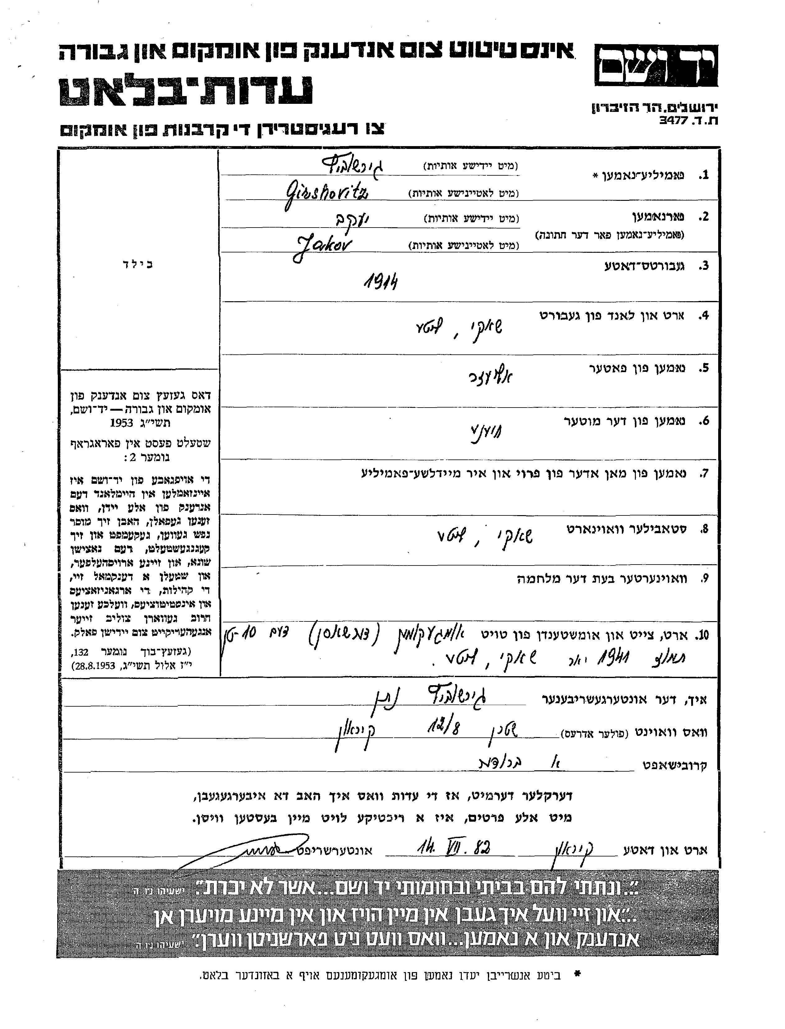 Jakov Girshovitz wurde im Jahr 1914 in Shaki, Litauen geboren. Er war der Sohn von Eliezer und Khaia. Vor dem Zweiten Weltkrieg lebte er in Shaki, Litauen.