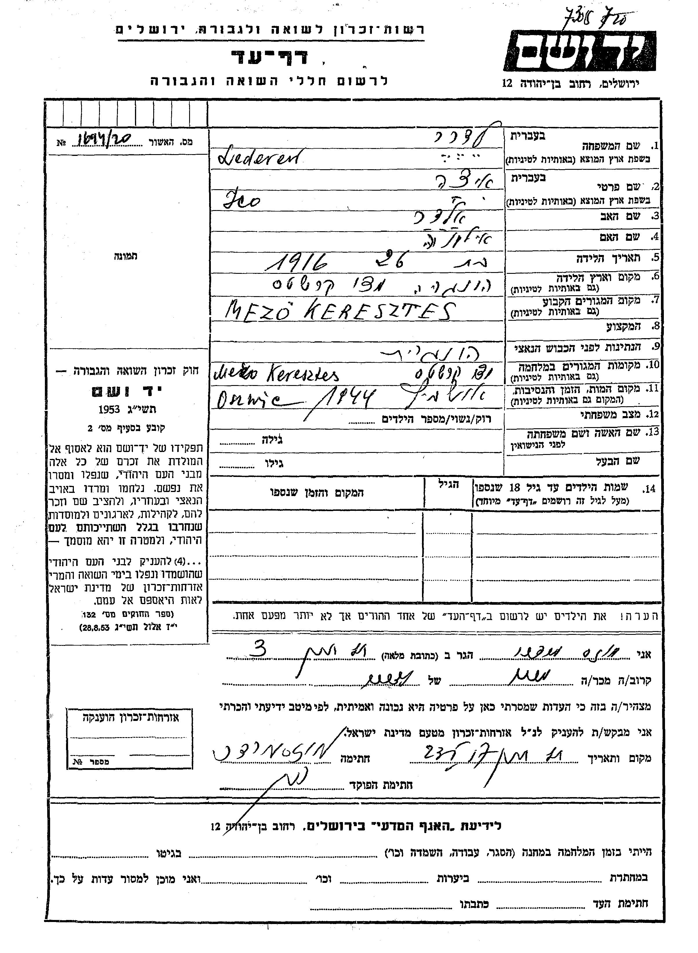 Leo Icie Lederer wurde im Jahr 1916 in Mezokeresztes, Ungarn geboren. Er war der Sohn von Aladar und Ilona. Vor dem Zweiten Weltkrieg lebte er in Mezokeresztes, Ungarn. Während des Krieges war er in Mezokeresztes, Ungarn.