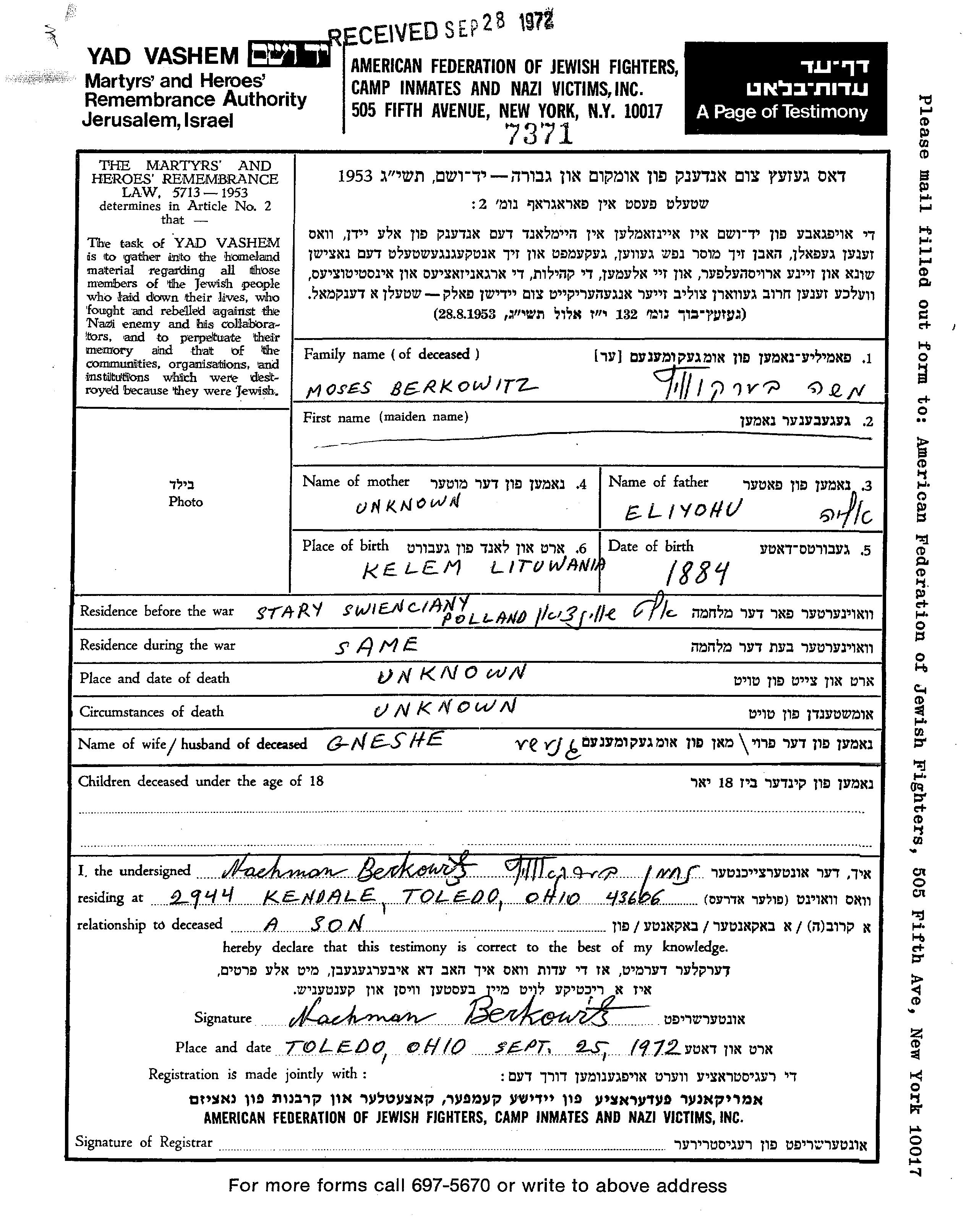 Aufenthaltsort während des Krieges/Schoah