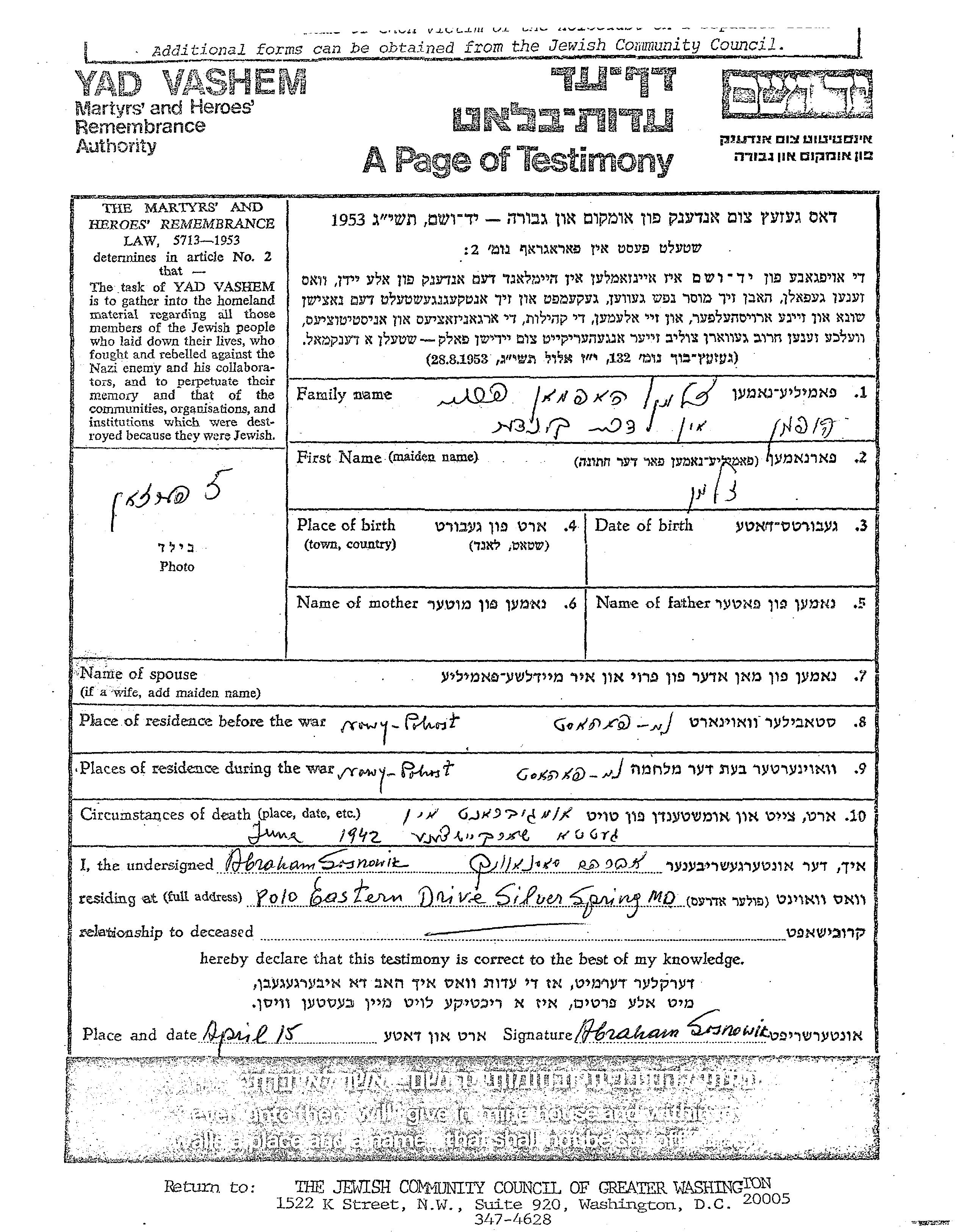 Zalman Hofman. Vor dem Zweiten Weltkrieg lebte er in Nowy Pohost, Polen. Während des Krieges war er in Nowy Pohost, Polen.