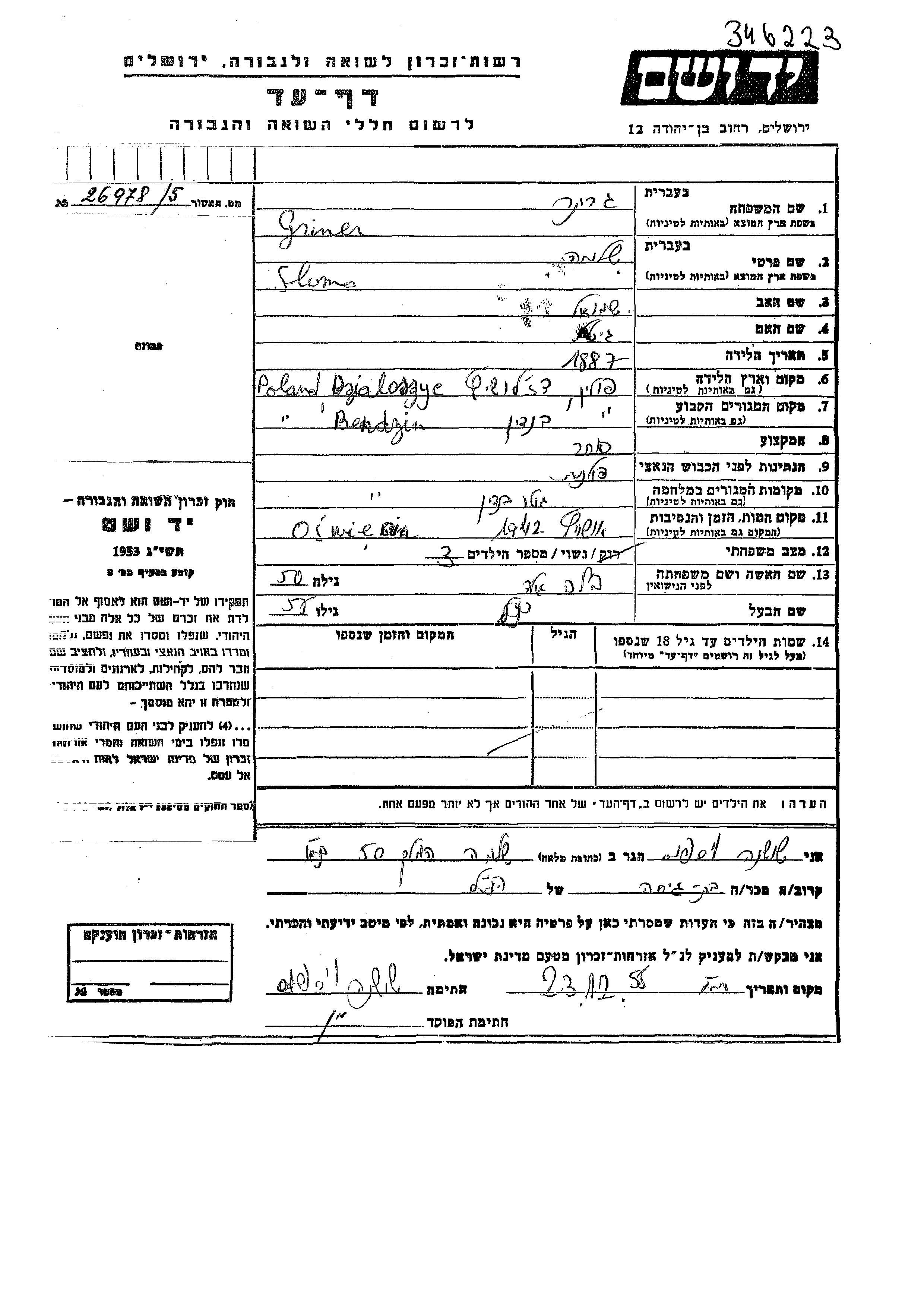 Slomo Griner wurde im Jahr 1887 in Dzialoszyce, Polen geboren. Er war der Sohn von Shmuel und Gitel. Er war Kaufmann/-frau und mit Bela Gita Verheiratet. Vor dem Zweiten Weltkrieg lebte er in Bendzin, Polen. Während des Krieges war er in Bendzin, Polen.