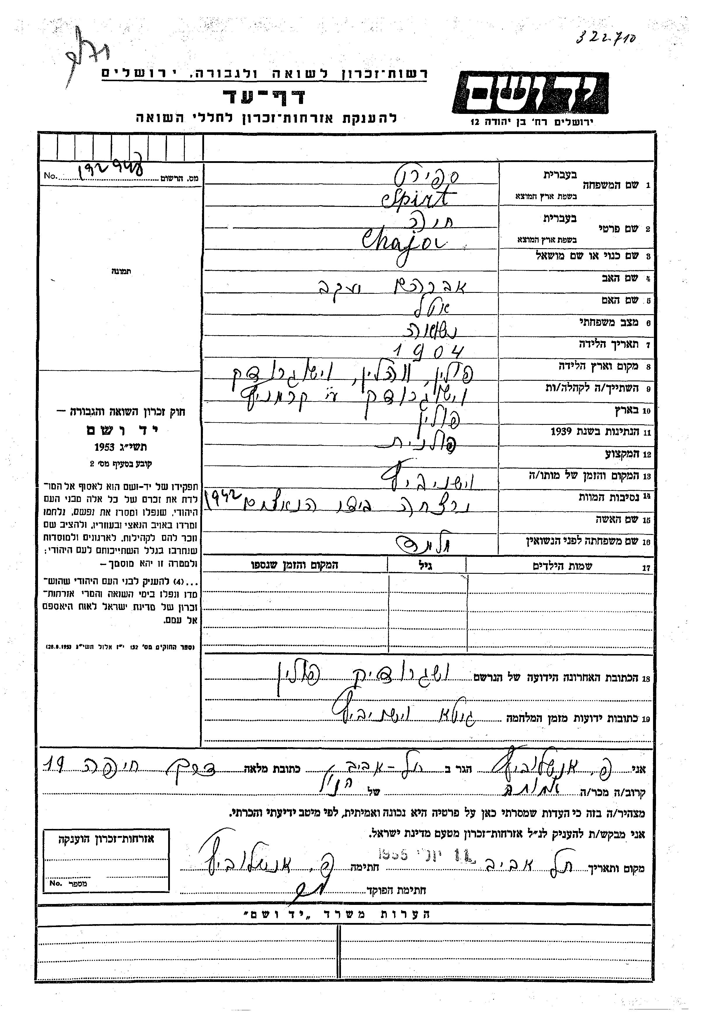Chaja wurde in der Schoah ermordet. Todesort: Wiśniowiec Nowy, Polen im Jahr 1942.