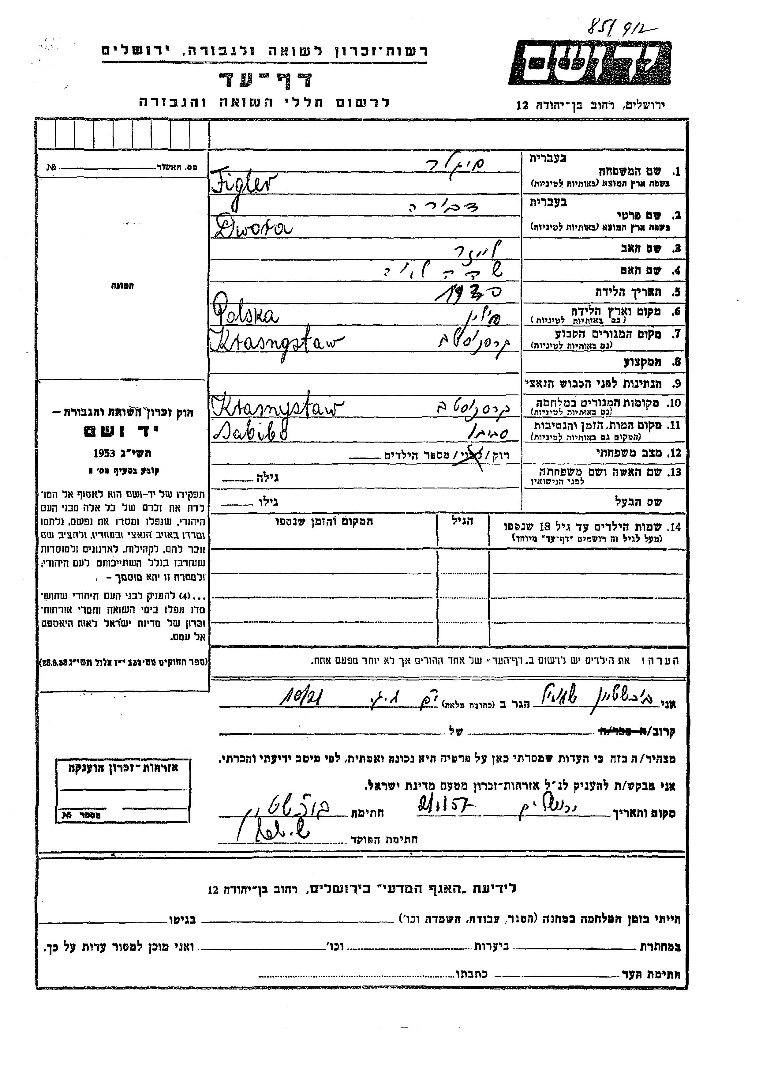 Dwora Figler wurde im Jahr 1920 in Polen geboren. Sie war die Tochter von Leizer und Sheva Lea. Sie war Ledig. Vor dem Zweiten Weltkrieg lebte sie in Krasnystaw, Polen. Während des Krieges war sie in Krasnystaw, Polen.