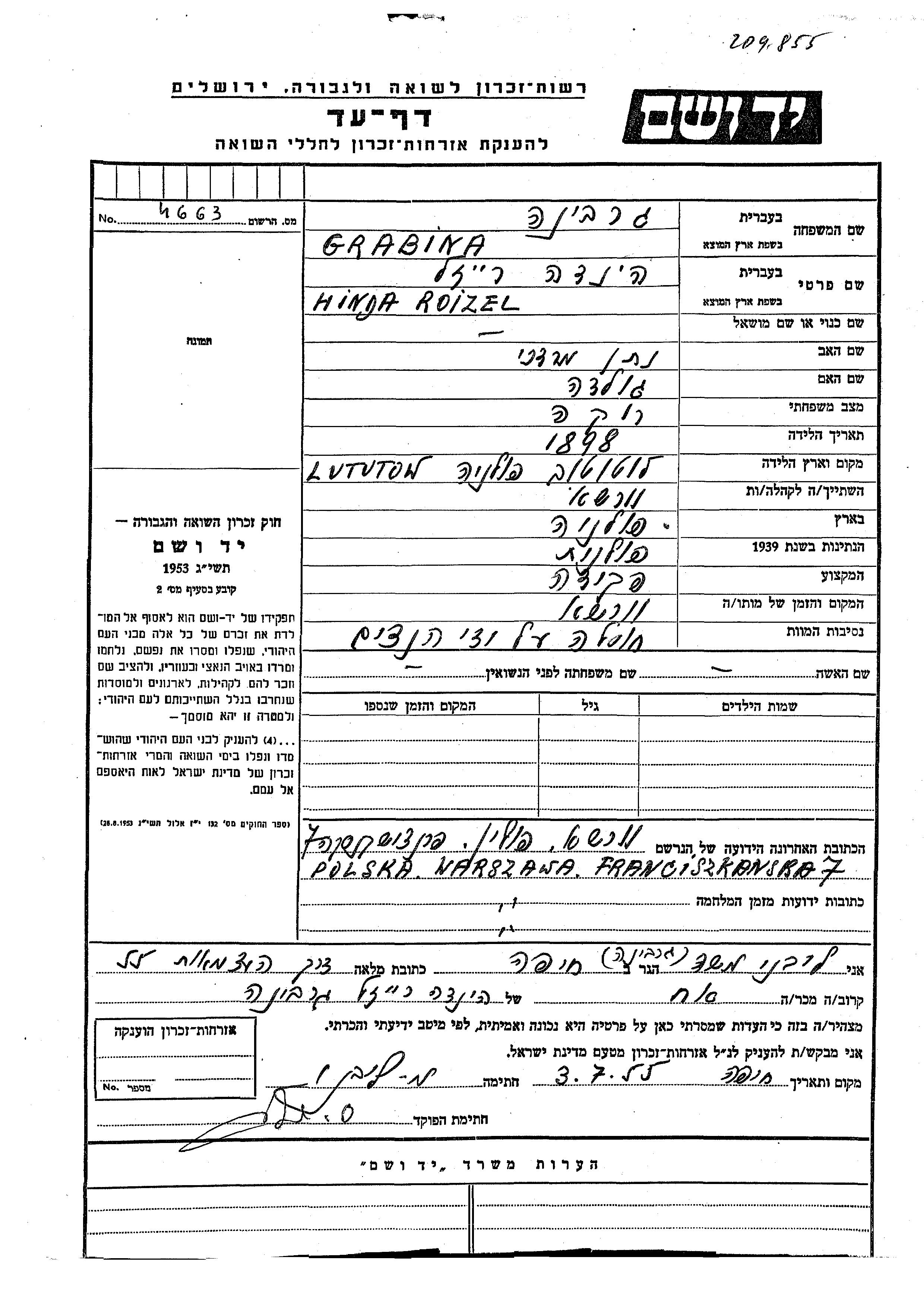 Roizel Hinda wurde in der Schoah ermordet. Todesort: Warszawa, Polen.