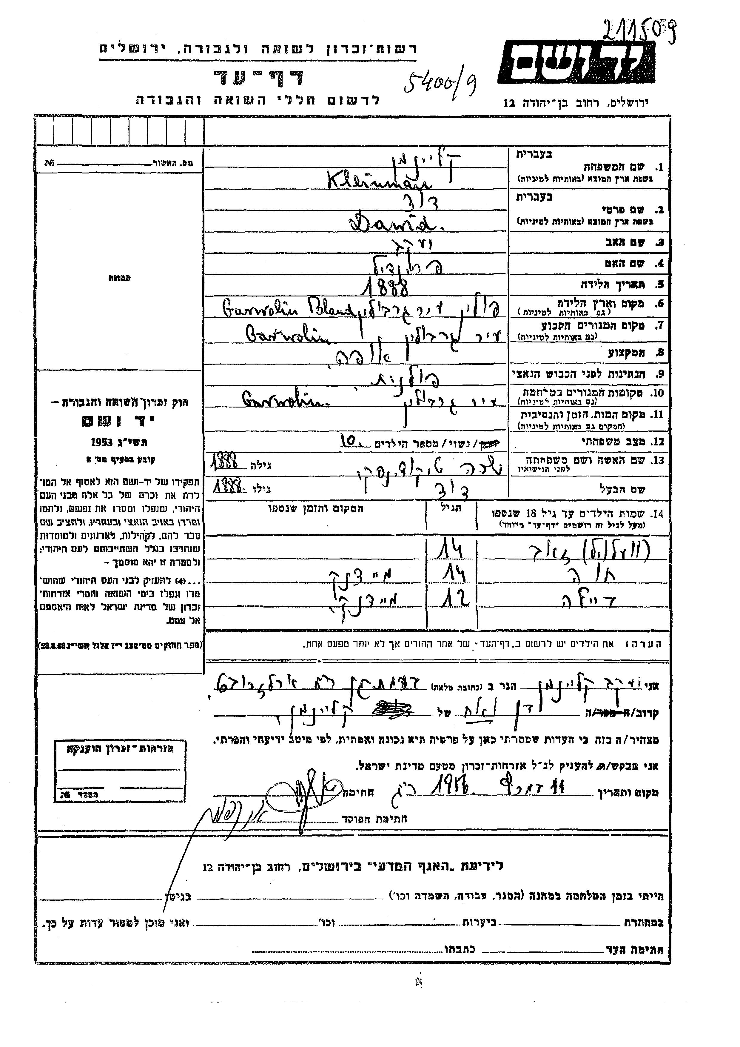 Dawid Kleinman wurde im Jahr 1888 in Garwolin, Polen geboren. Er war der Sohn von Yaakov und Freida. Er war Bäcker/-in und mit Sara, geb. Tikochinski Verheiratet. Vor dem Zweiten Weltkrieg lebte er in Garwolin, Polen. Während des Krieges war er in Garwolin, Polen.
