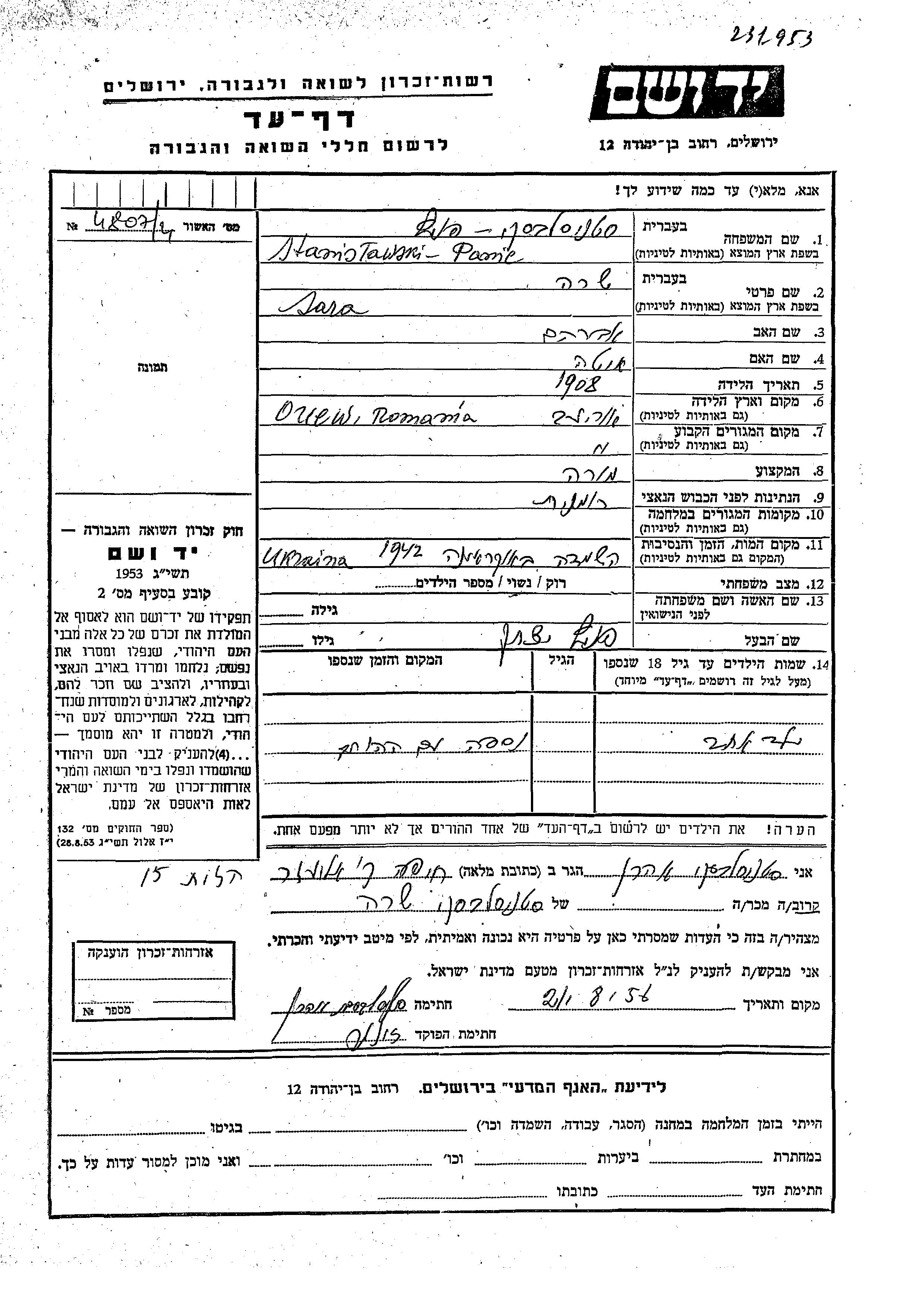 Sara Stanislawski Panic, geb. Stanislawski wurde im Jahr 1908 in Oriew, Rumänien geboren. Sie war die Tochter von Avraham und Ita. Sie war Lehrer/in und mit Yitzkhak Verheiratet. Vor dem Zweiten Weltkrieg lebte sie in Oriew, Rumänien.