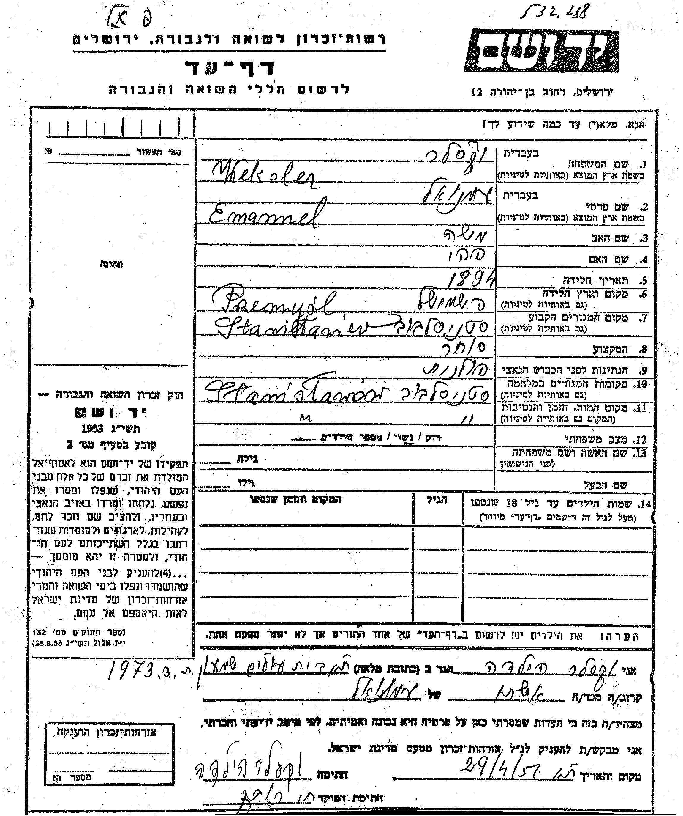 Emanuel Weksler wurde im Jahr 1894 in Przemysl, Polen geboren. Er war der Sohn von Moshe und Pepi. Er war Kaufmann/-frau und mit Hilda Verheiratet. Vor dem Zweiten Weltkrieg lebte er in Stanislawow, Polen. Während des Krieges war er in Stanislawow, Polen.
