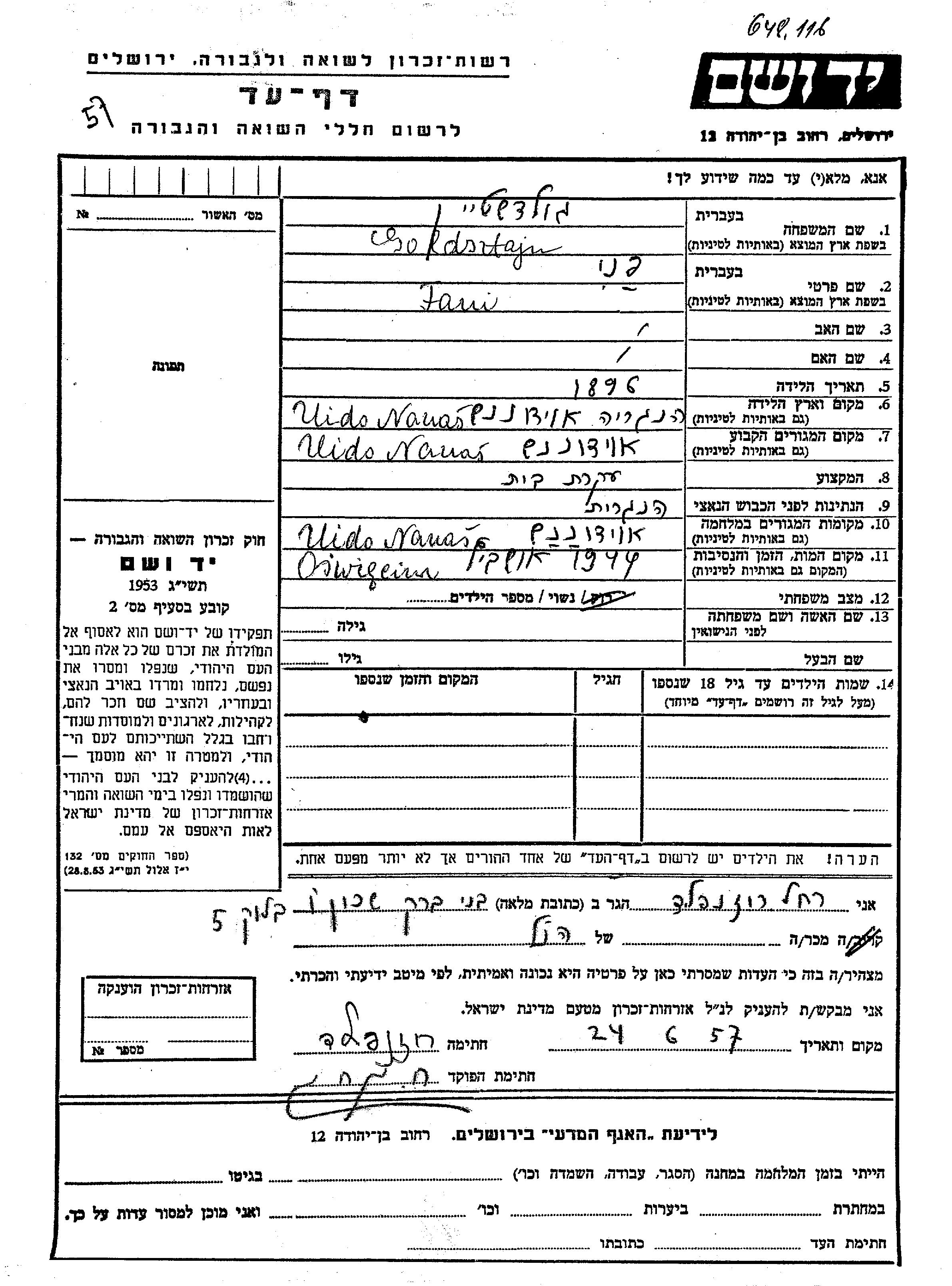 Fani Goldsztajn wurde im Jahr 1896 in Uido Nanas, Ungarn geboren. Sie war Hausfrau und Verheiratet. Vor dem Zweiten Weltkrieg lebte sie in Uido Nanas, Ungarn. Während des Krieges war sie in Uido Nanas, Ungarn.