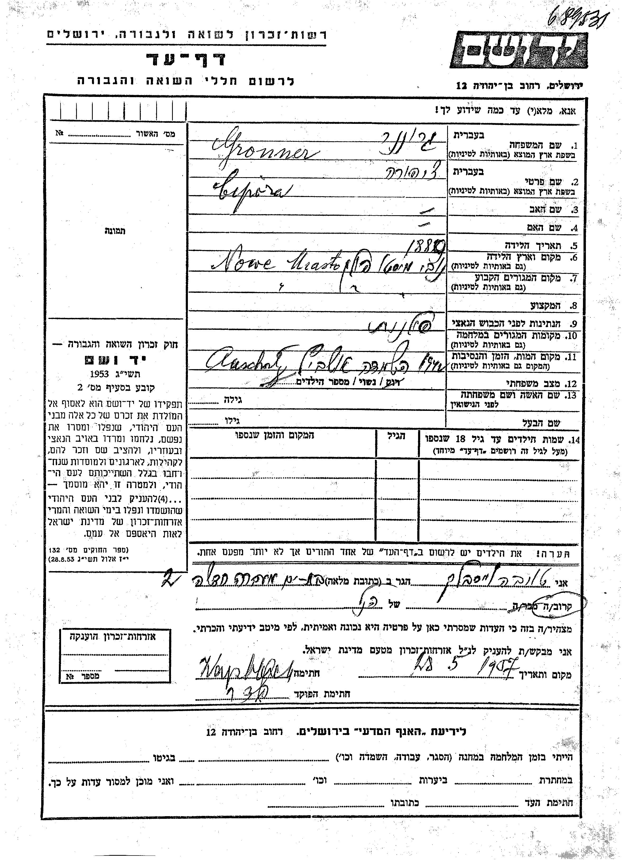 Cipora Gronner Gruner wurde im Jahr 1889 in Nowe Miasto, Polen geboren. Sie war Verheiratet. Vor dem Zweiten Weltkrieg lebte sie in Nowe Miasto, Polen.