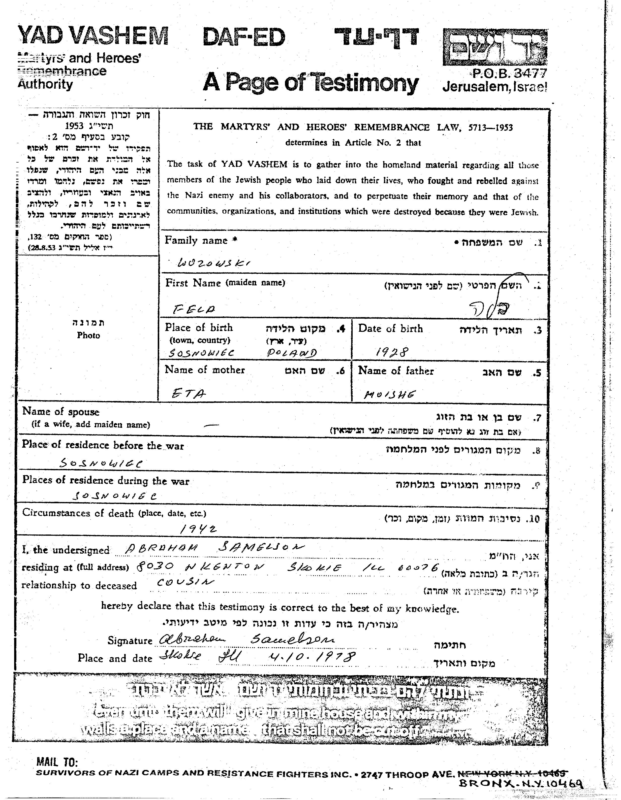 Fela Wozowski wurde im Jahr 1928 in Sosnowiec, Polen geboren. Sie war die Tochter von Moishe und Eta. Vor dem Zweiten Weltkrieg lebte sie in Sosnowiec, Polen. Während des Krieges war sie in Sosnowiec, Polen.