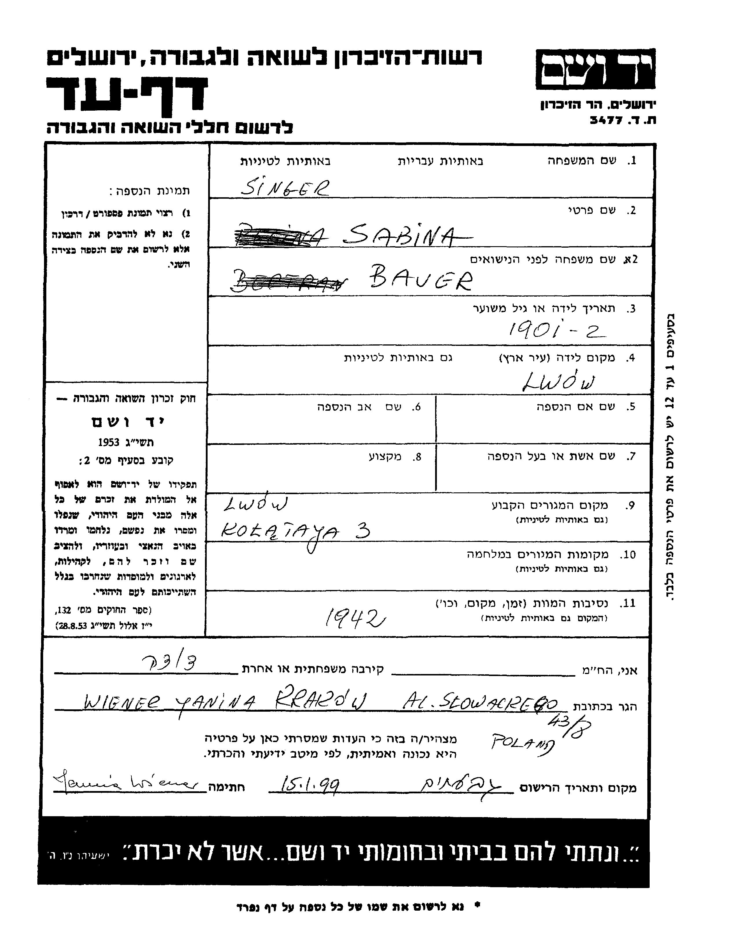 Sabina Singer wurde im Jahr 1901 in Lwow, Polen geboren. Vor dem Zweiten Weltkrieg lebte sie in Lwow, Polen.