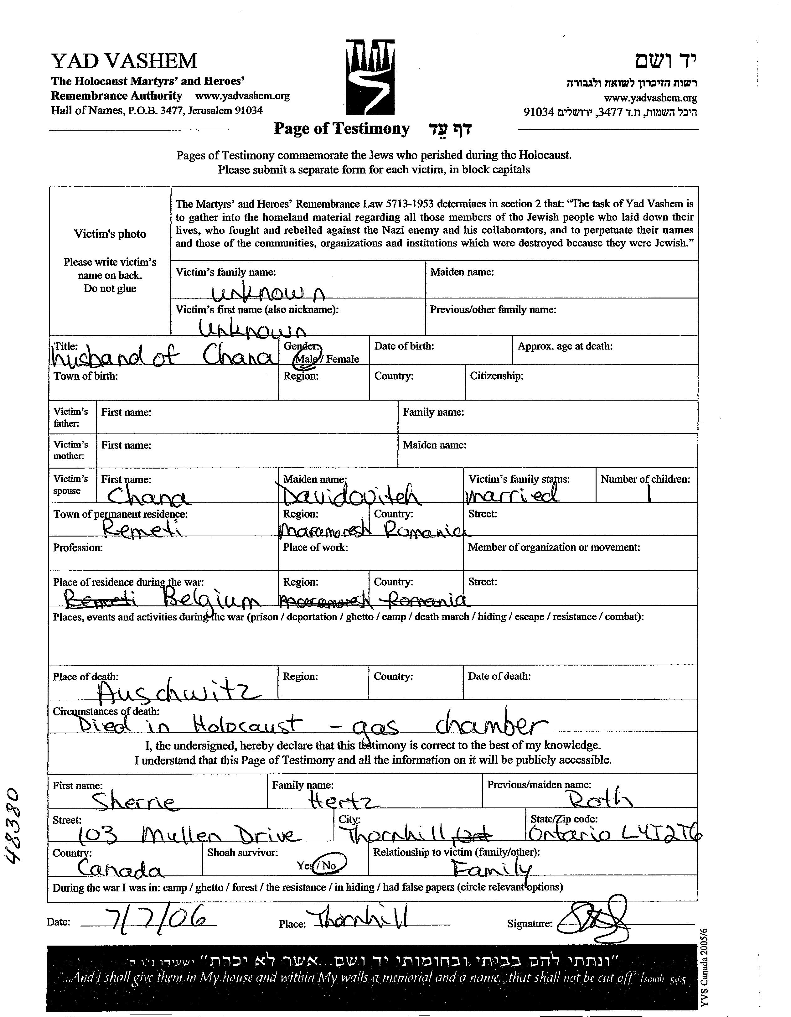 Vorname unbekannt Name unbekannt. Er war mit Chana, geb. Davidovitch Verheiratet. Vor dem Zweiten Weltkrieg lebte er in Remeti, Rumänien. Während des Krieges war er in Belgien.