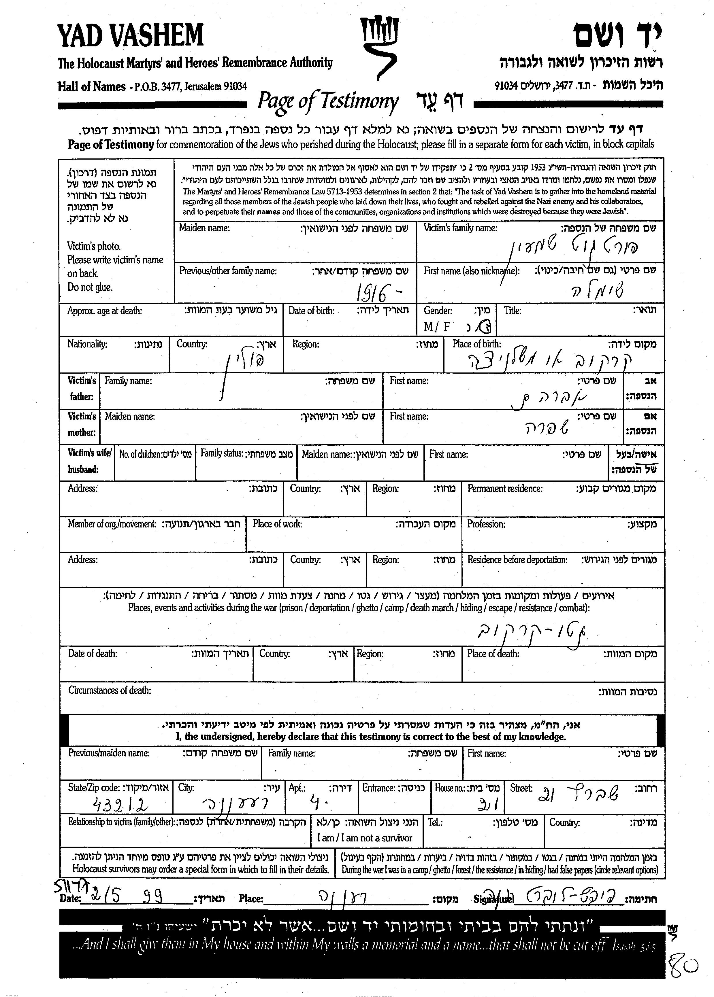 Shimale פורטגוט wurde im Jahr 1916 in Krakow, Polen geboren. Er war der Sohn von Avraham und Shifra. Vor dem Zweiten Weltkrieg lebte er in Krakow, Polen. Während des Krieges war er in Krakow, Polen.