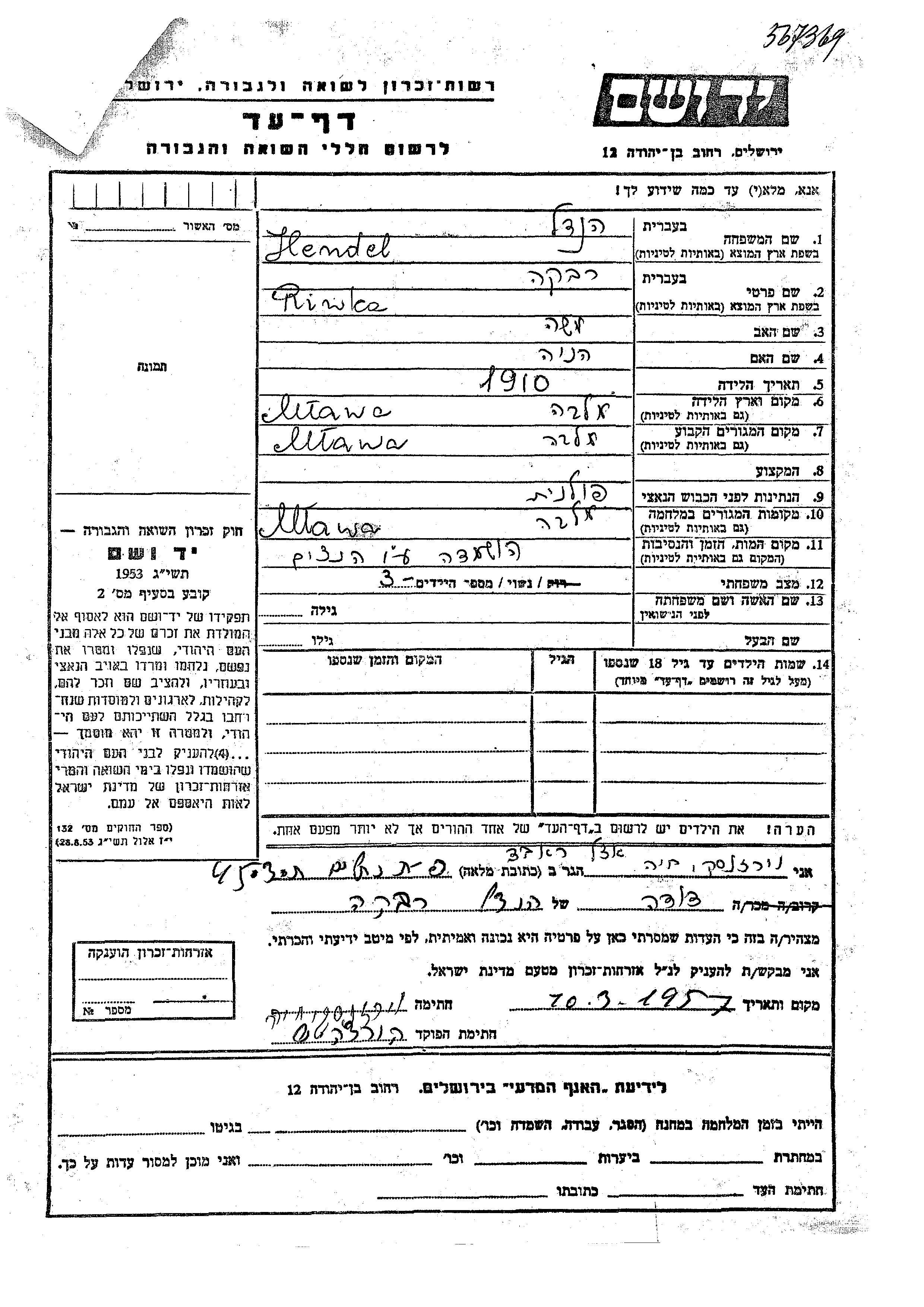 Riwka Hendel wurde im Jahr 1910 in Mlawa, Polen geboren. Sie war die Tochter von Moshe und Henia. Sie war Verheiratet. Vor dem Zweiten Weltkrieg lebte sie in Mlawa, Polen. Während des Krieges war sie in Mlawa, Polen.