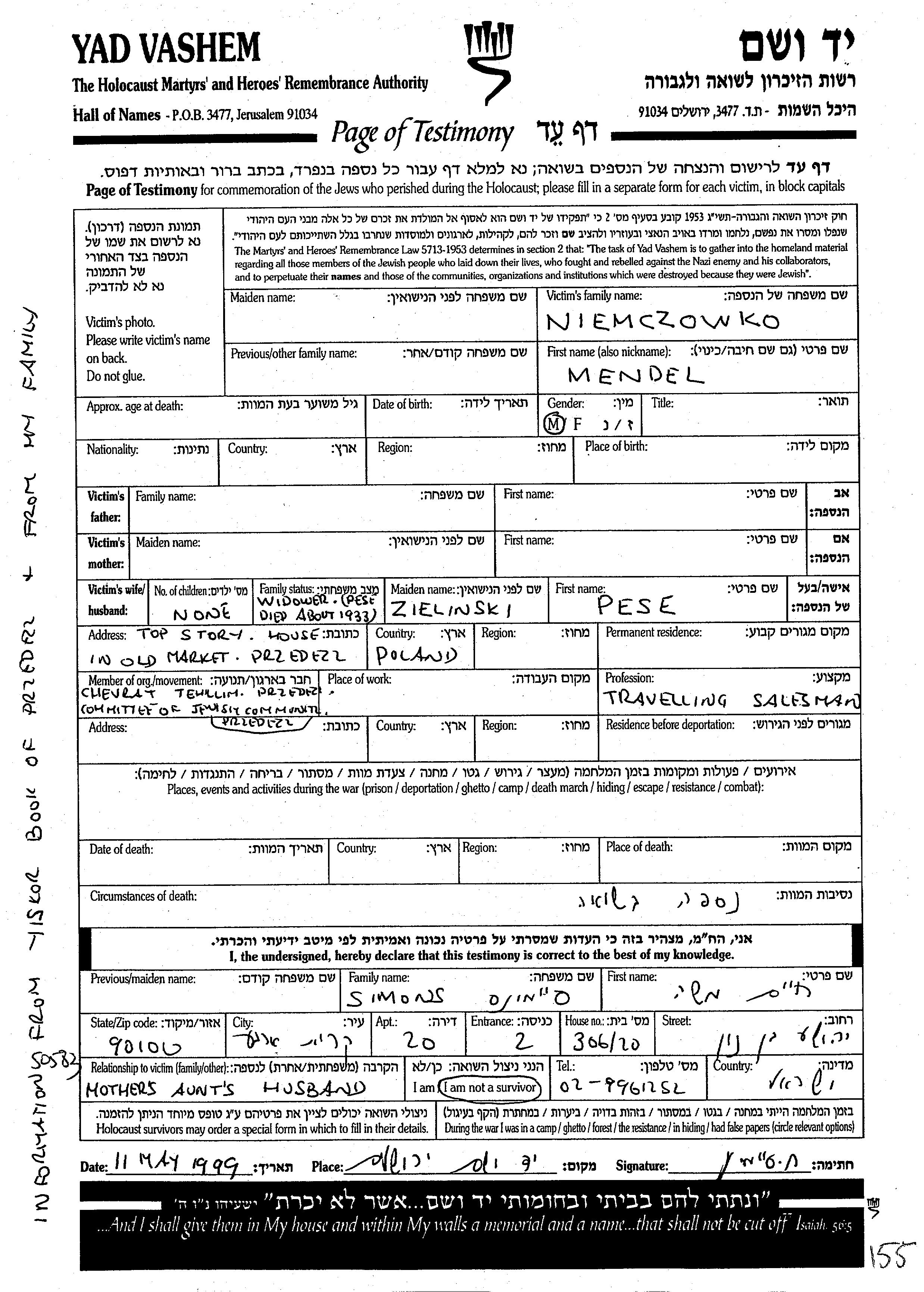 Mendel Niemczowko. Er war Travelling agent und mit Pese, geb. Zielinski Witwer. Vor dem Zweiten Weltkrieg lebte er in Przedecz, Polen.