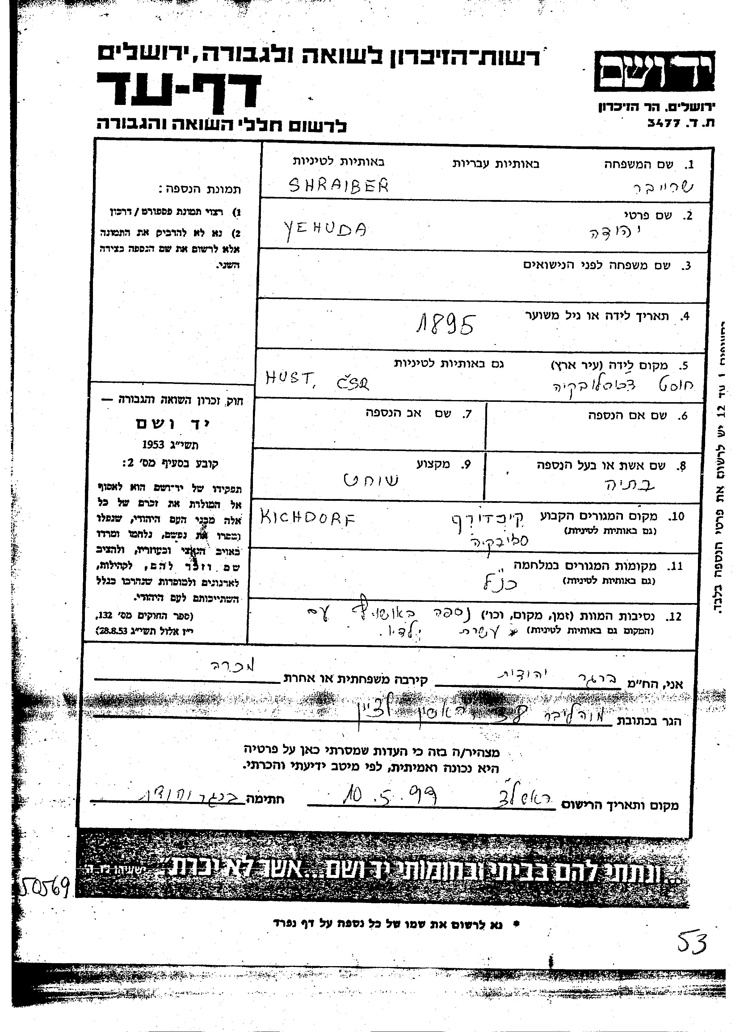 Yehuda Shraiber wurde im Jahr 1895 in Hust, Tschechoslowakei geboren. Er war Schächter. Vor dem Zweiten Weltkrieg lebte er in Kirchdorf, Tschechoslowakei. Während des Krieges war er in Kirchdorf, Tschechoslowakei.