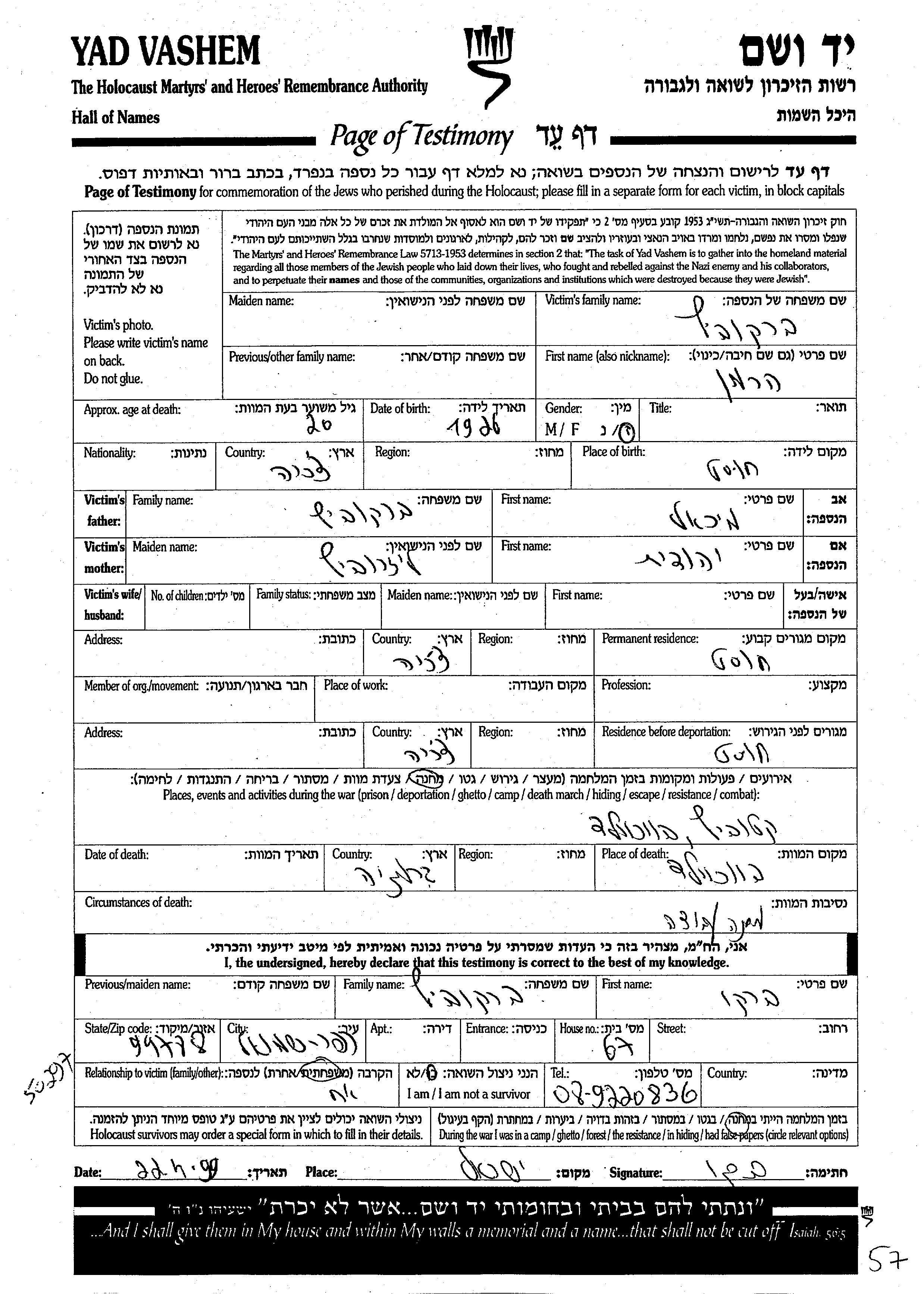 Berkovitz Herman 1926 Chust, Tschechoslowakei Gedenkblatt
