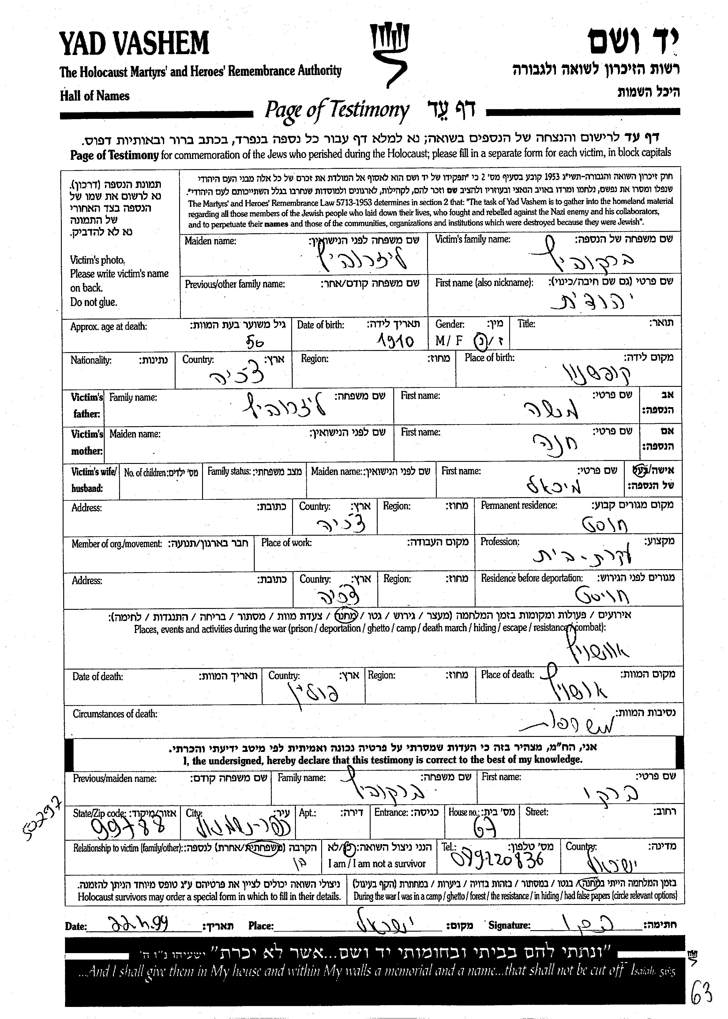 Berkovitz Yehudit 1910 Chust, Tschechoslowakei Gedenkblatt