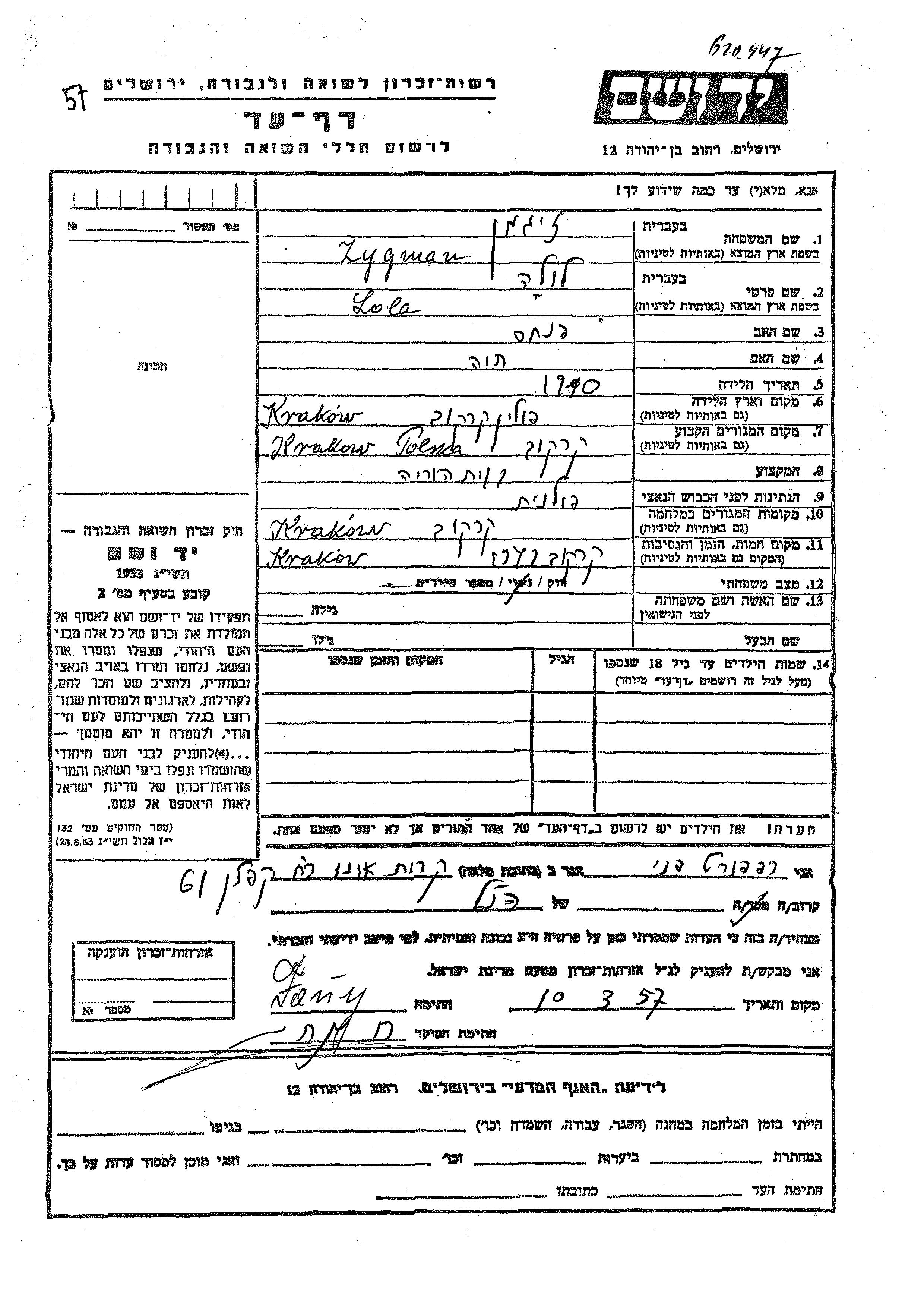 Lola Zygman wurde im Jahr 1910 in Krakow, Polen geboren. Sie war die Tochter von Pinkhas und Khaia. Sie war Ledig. Vor dem Zweiten Weltkrieg lebte sie in Krakow, Polen. Während des Krieges war sie in Krakow, Polen.