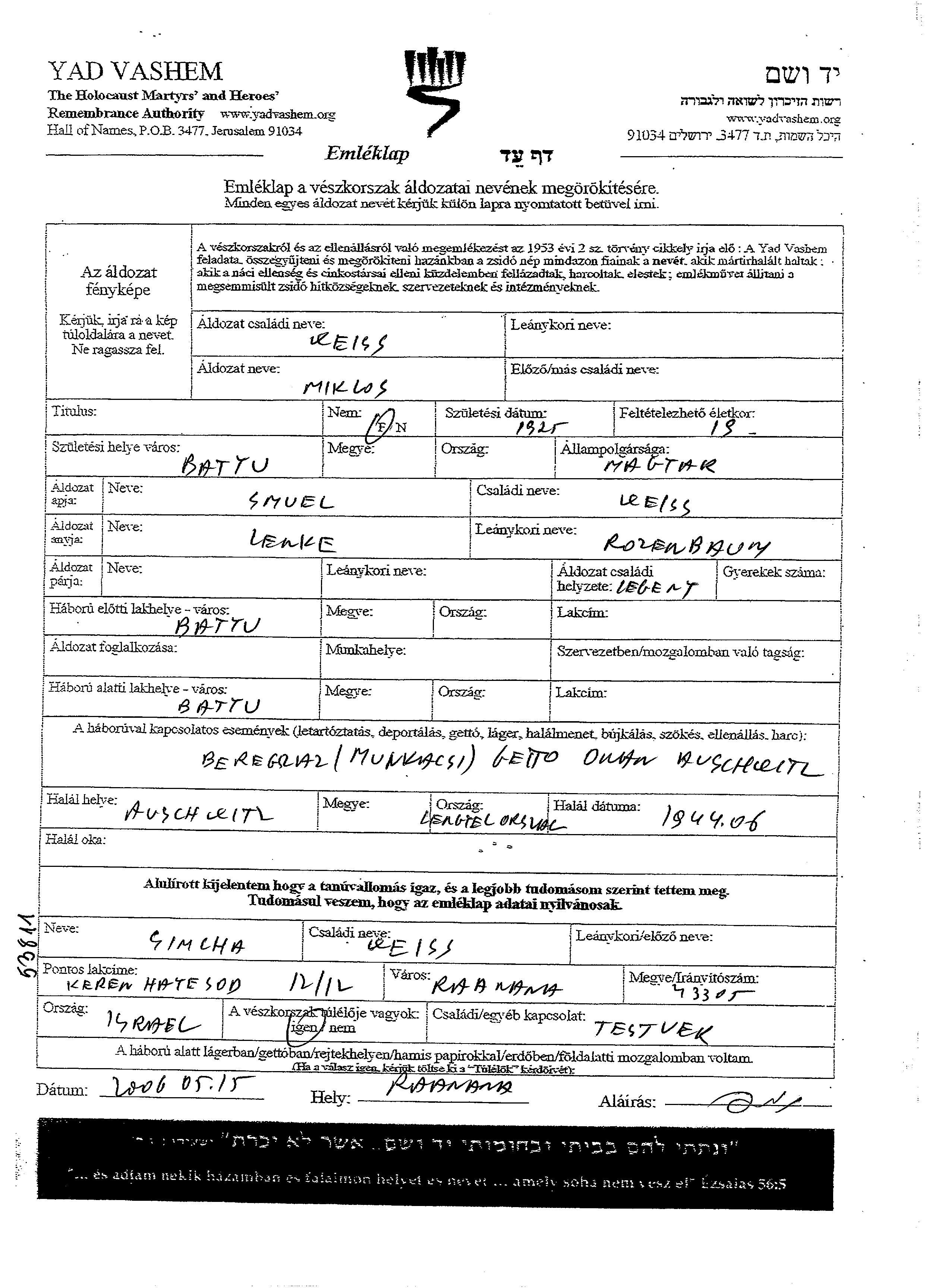 Miklos Weiss wurde im Jahr 1925 in Batyu, Tschechoslowakei geboren. Er war der Sohn von Smuel und Lenke, geb. Rozenbaum. Er war Ledig. Vor dem Zweiten Weltkrieg lebte er in Batyu, Tschechoslowakei. Während des Krieges war er in Batyu, Tschechoslowakei.